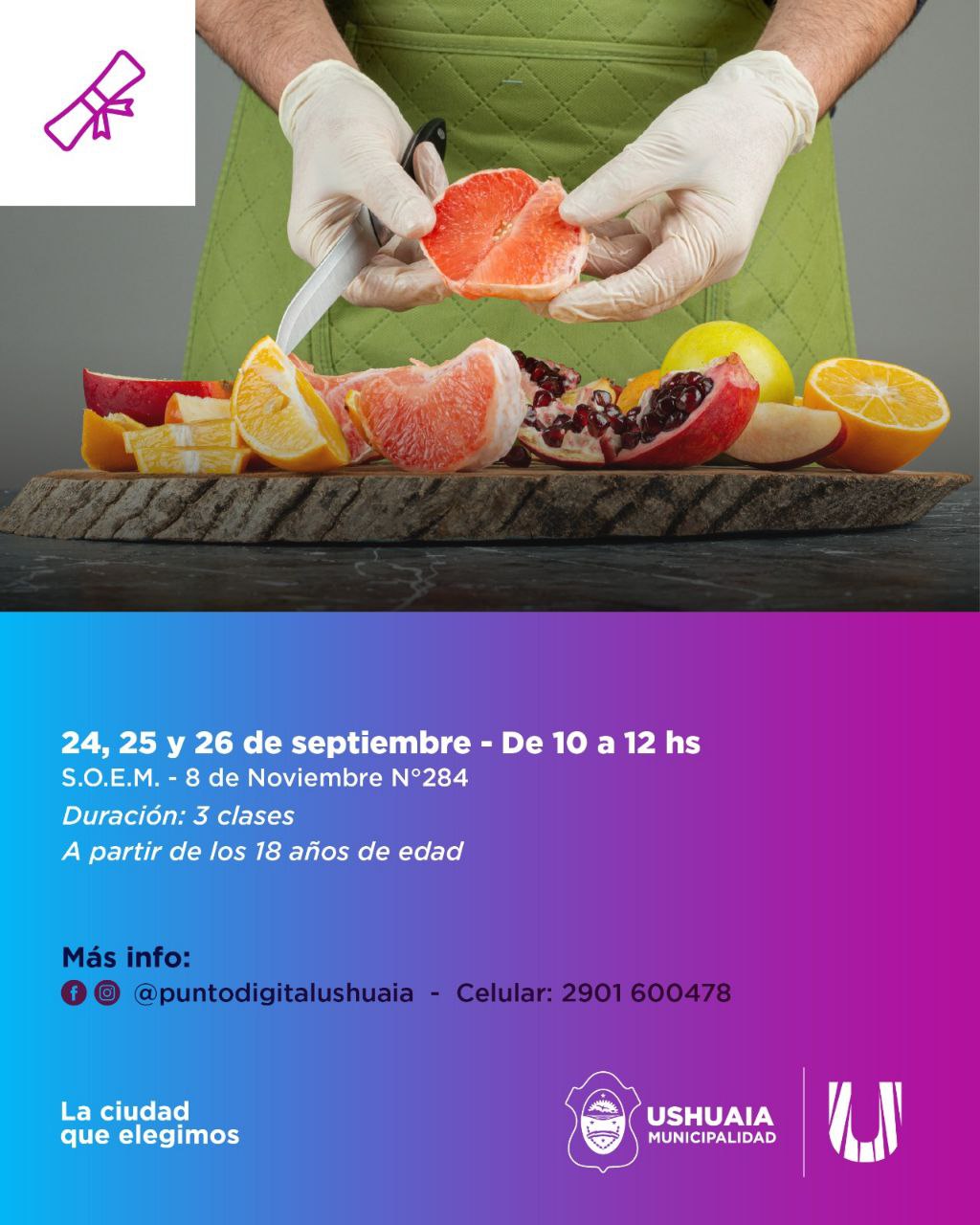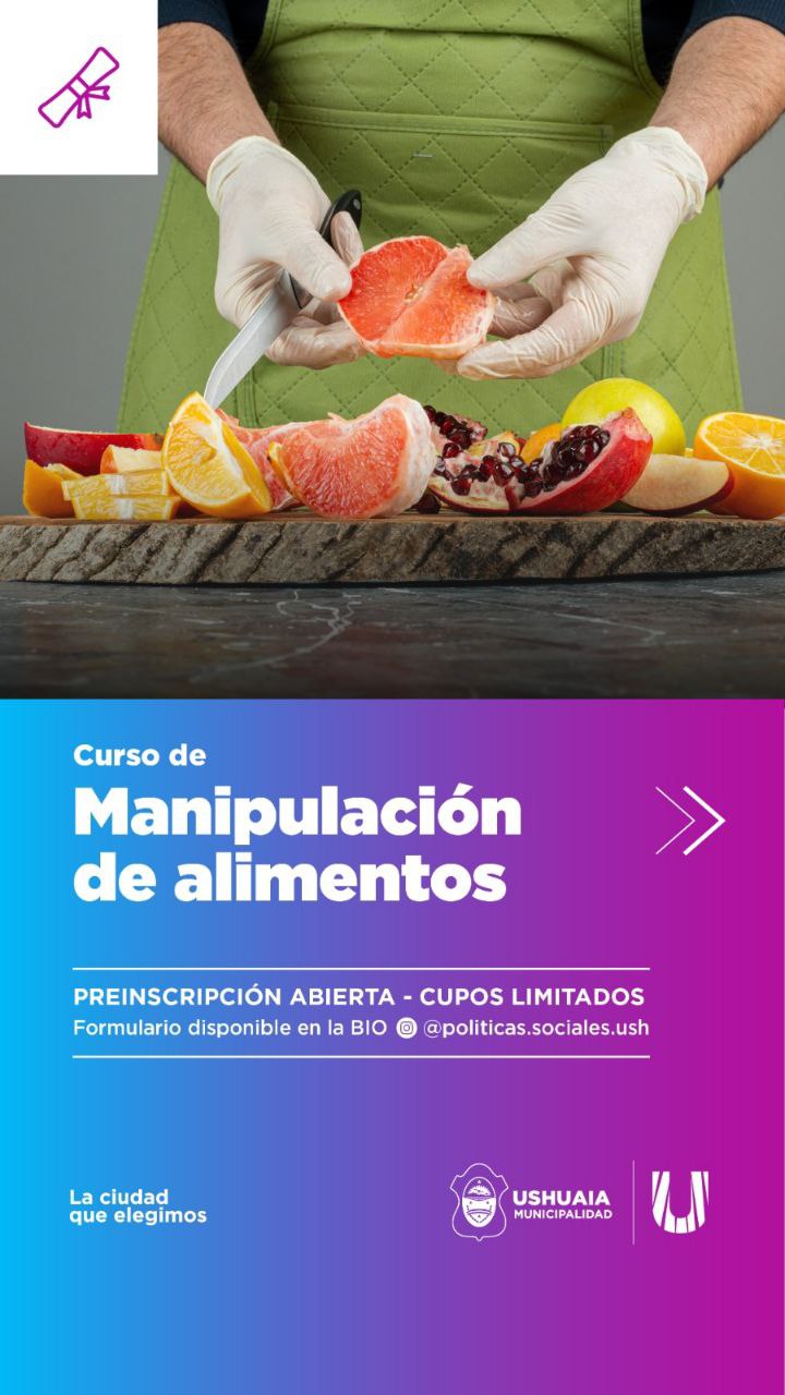 La Secretaría de Políticas Sociales, Sanitarias y Derechos Humanos de la Municipalidad de Ushuaia, a través del Punto Digital, llevará adelante una nueva edición del taller gratuito de manipulación de alimentos, destinado a vecinos y vecinas de la ciudad mayores de 18 años.