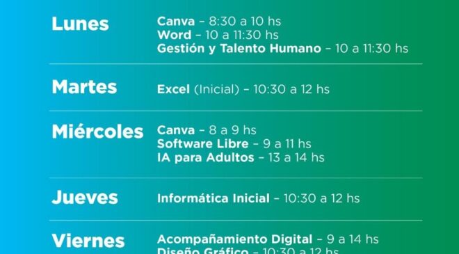 La oferta formativa incluye cursos de Canva, Word, Excel, Informática Inicial, Software Libre, Diseño Gráfico, Inteligencia Artificial para adultos, Gestión y Talento Humano, además de un espacio de acompañamiento digital destinado a fortalecer habilidades tecnológicas y facilitar el acceso a herramientas digitales.
