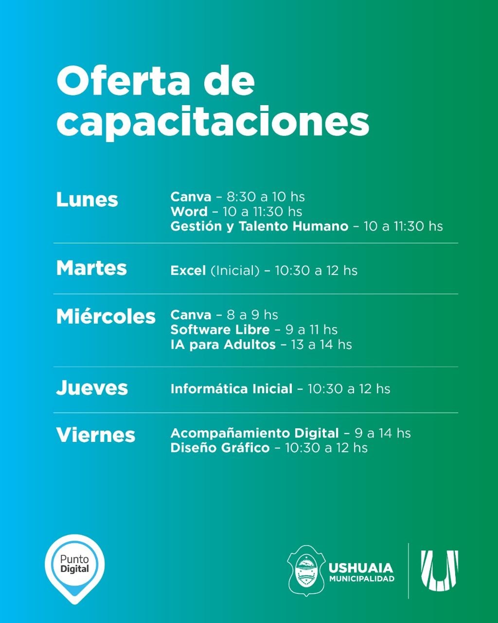La Municipalidad de Ushuaia, a través de la Secretaría de la Mujer y Desarrollo Humano, informa que se encuentran abiertas las inscripciones para las capacitaciones que se dictarán en el espacio Punto Digital, ubicado en Kuanip 2089, esquina La Pampa.