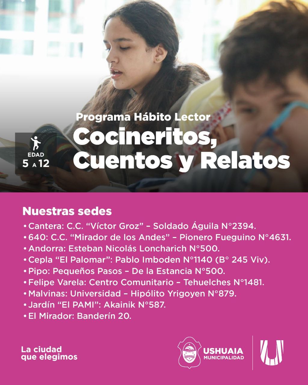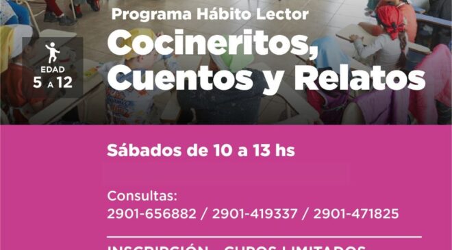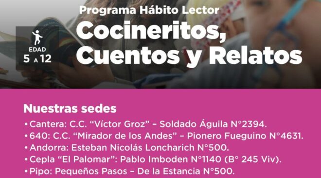 La Secretaría de Políticas Ambientales, Culturales y Educativas de la Municipalidad de Ushuaia informa a la comunidad que se encuentran abiertas las inscripciones al del programa Hábito Lector: Cocineritos, Cuentos y Relatos.