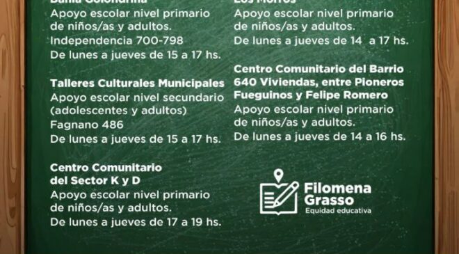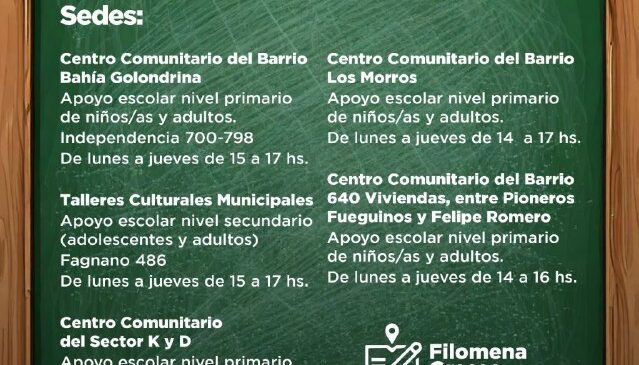 Dicha iniciativa municipal, que acompañará el ciclo lectivo 2025, contará con sedes en el Centro Comunitario del Barrio Bahía Golondrina para niños, niñas y adultos del nivel primario de lunes a jueves de 15:00 a 17:00 horas; en los talleres culturales municipales de Fagnano N° 486 para nivel secundario de adolescentes y adultos en el mismo horario; en el Centro Comunitario del Sector KyD en el nivel primario de lunes a jueves de 17:00 a 19:00 horas; en el Centro Comunitario del Barrio Los Morros para el nivel primario de niños, niñas y adultos de lunes a jueves de 14:00 a 17:00 horas y en el Centro Comunitario del Barrio 640 Viviendas también en nivel primario de lunes a jueves de 14:00 a 16:00 horas. Para inscribirse o acceder a más información, las y los interesados podrán contactarse al WhatsApp 2901-632466.