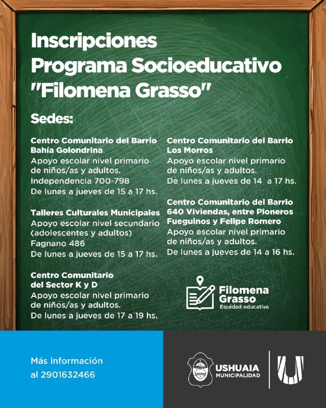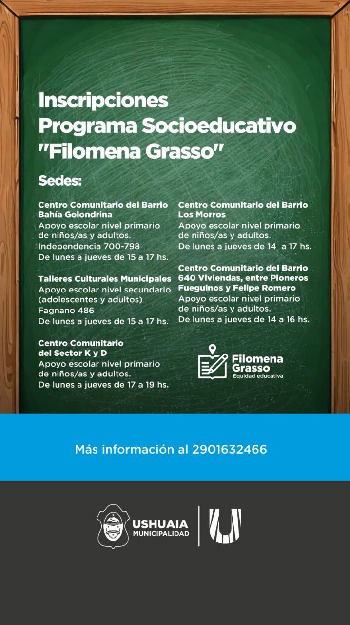 La Municipalidad de Ushuaia, a través de la Secretaría de Cultura y Educación, informa a vecinos y vecinas que se encuentran abiertas las inscripciones al programa socioeducativo “Filomena Grasso”, iniciativa que brinda apoyo escolar en los niveles primario y secundario.