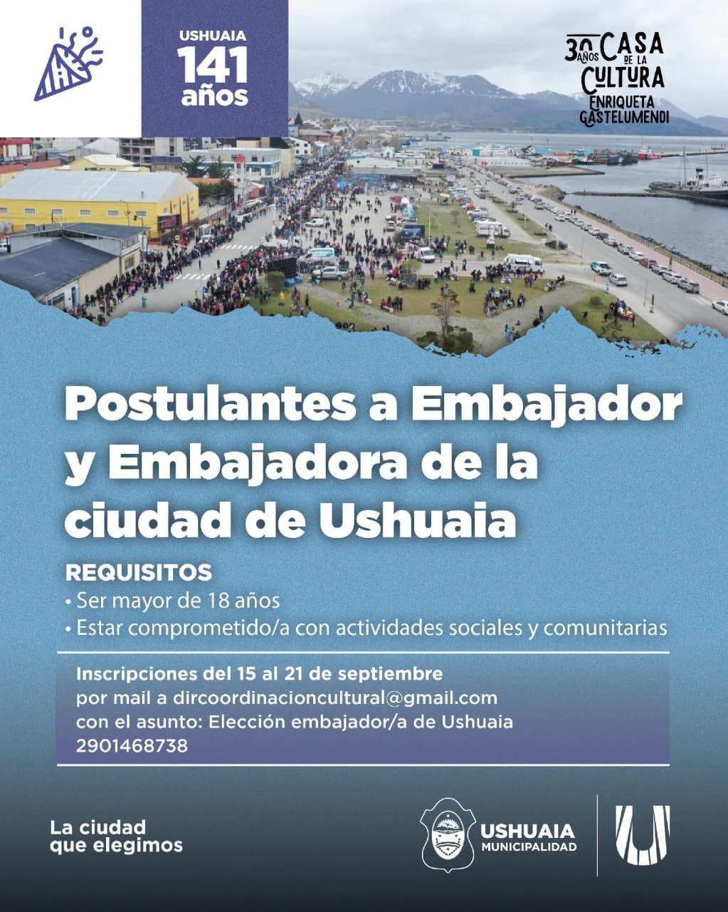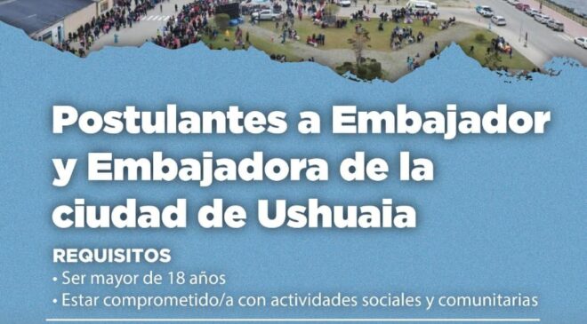 La Secretaría de Cultura y Educación de la Municipalidad de Ushuaia informa a los vecinos y vecinas de la ciudad que se encuentra abierta la convocatoria para el embajador y embajadora de la ciudad, parte de los festejos por el 141° Aniversario de Ushuaia.