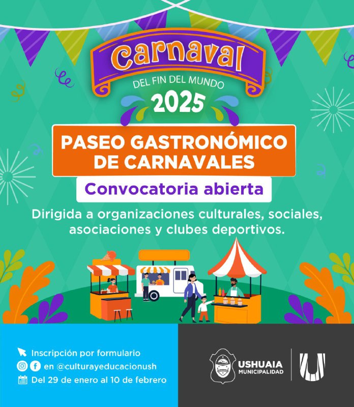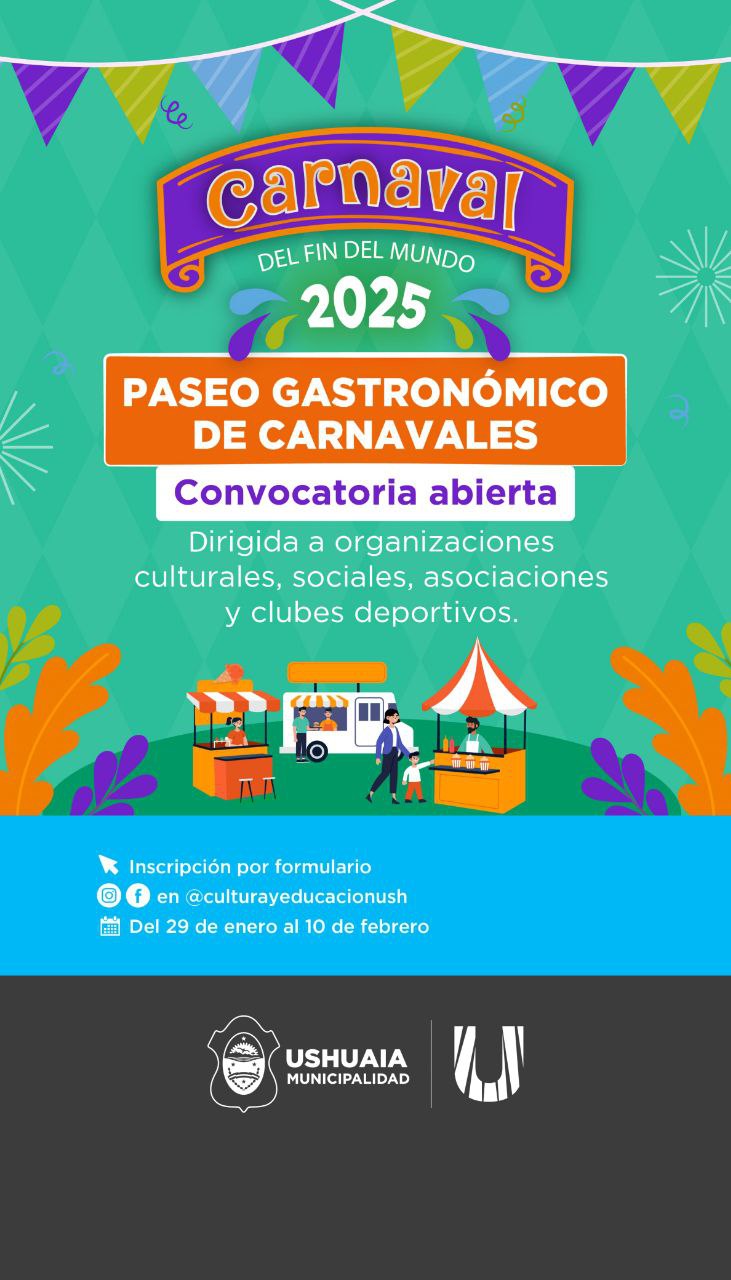 La Secretaría de Cultura y Educación de la Municipalidad de Ushuaia, en el marco del “Carnaval del Fin del Mundo 2025”, informa a vecinos y vecinas que se encuentra abiertas las inscripciones para ser parte del Paseo Gastronómico.