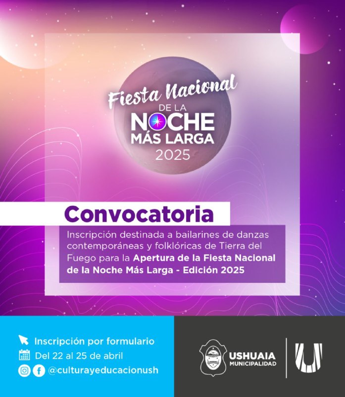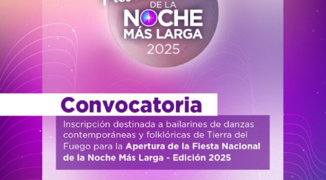 En el marco de la Fiesta Nacional de la Noche Más Larga, la Secretaría de Cultura y Educación de la Municipalidad de Ushuaia informa a la comunidad que se abrirá una nueva convocatoria de bailarinas y bailarines fueguinos para la ceremonia de apertura.