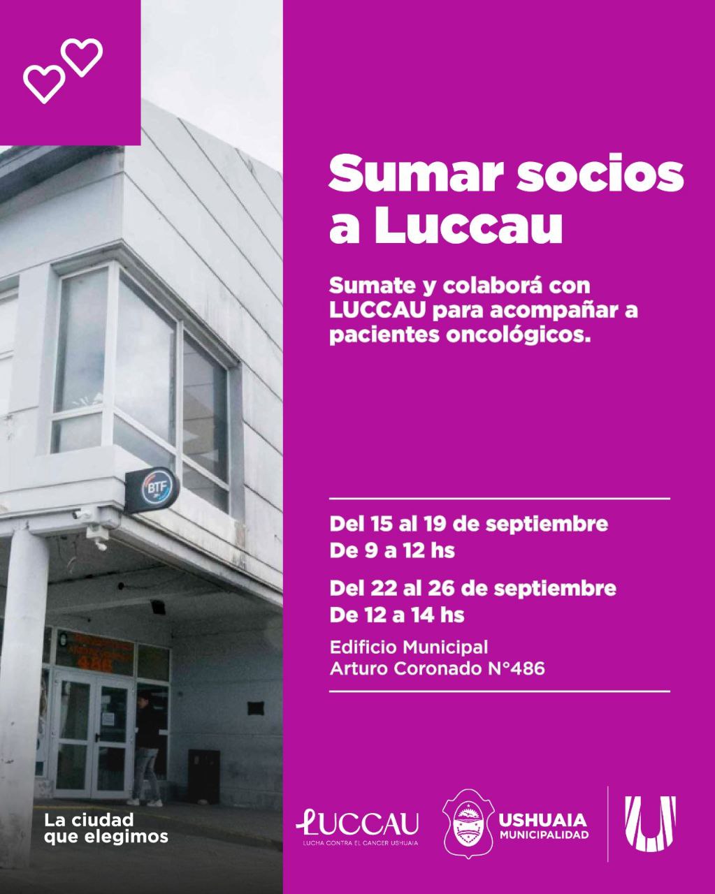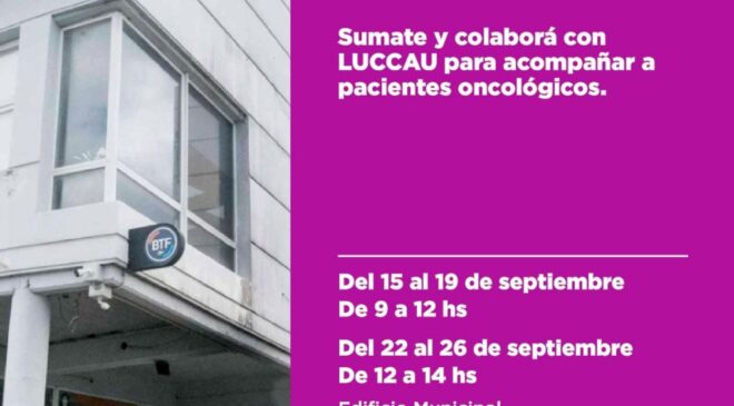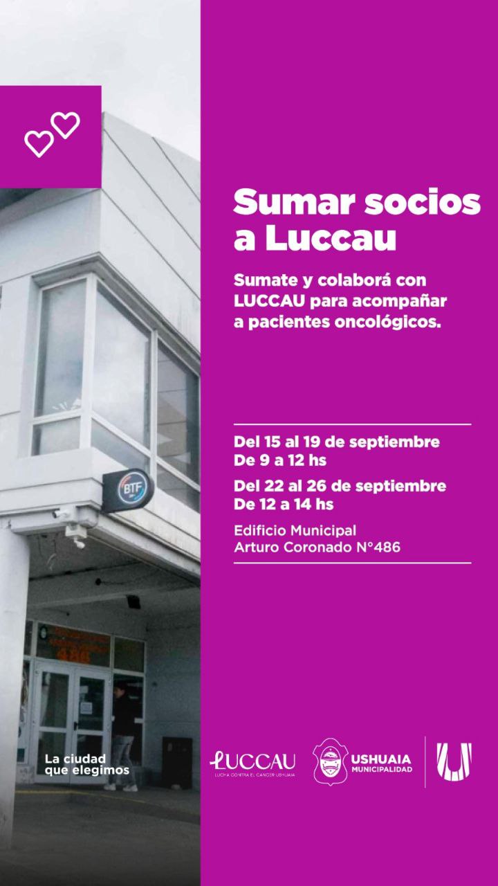 La Municipalidad de Ushuaia, junto a la asociación Lucha Contra el Cáncer Ushuaia (LUCCAU), llevará adelante la campaña “Sumar socios a Luccau”, que se desarrollará del 15 al 26 de septiembre en el edificio municipal de calle Arturo Coronado.