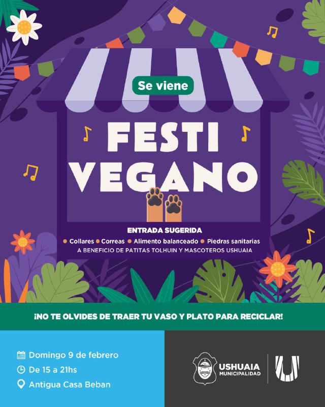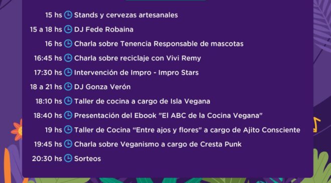 La iniciativa, que tendrá como entrada sugerida collares, correas, alimento balanceado y piedras sanitarias a donarse a Patitas Tolhuin y Mascoteros Ushuaia, contará con puestos de emprendedores y emprendedoras, charlas sobre tenencia responsable de mascotas, de reciclaje a cargo de Viviana Remy, los talleres de cocina por parte de Isla Vegana y Ajito Consciente de “Entre ajos y flores”, la presentación del ebook “El ABC de la cocina vegana” y una charla sobre veganismo por Cresta Punk. Acompañando la jornada estarán los Djs Fede Robaina y Gonza Verón, así como la intervención de Impro- Impro Stars junto a sorteros para las y los asistentes. Asimismo, se recomienda a quiénes visiten el “Festi Vegano” llevar su plato y vaso para evitar la utilización de envases de un solo uso.