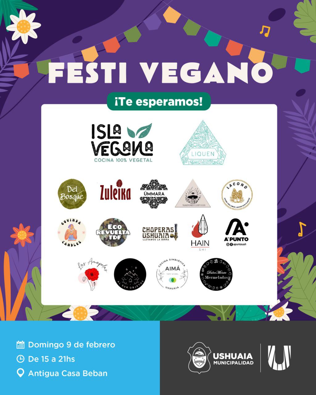 La Secretaría de Cultura y Educación de la Municipalidad de Ushuaia acompañará este domingo 9 de febrero en la Antigua Casa Beban el “Festi Vegano” impulsado por Isla Vegana y Liquen Biocosmética. La propuesta contará con espectáculos musicales, charlas, talleres y puestos de emprendedores y emprendedoras a partir de las 15:00 horas.