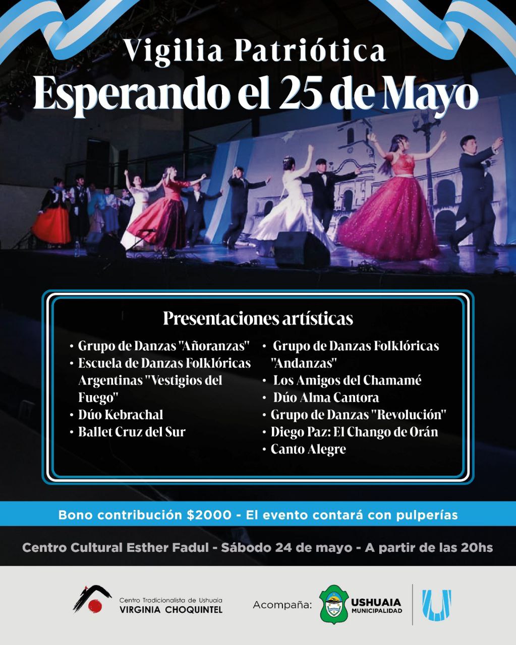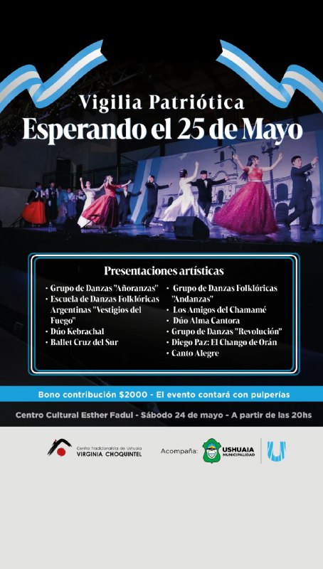 La Municipalidad de Ushuaia, a través de la Secretaría de Cultura y Educación, acompañará este sábado 24 de mayo a las 20:00 horas en el Centro Cultural Esther Fadul la Vigilia Patriótica “Esperando el 25 de Mayo”.