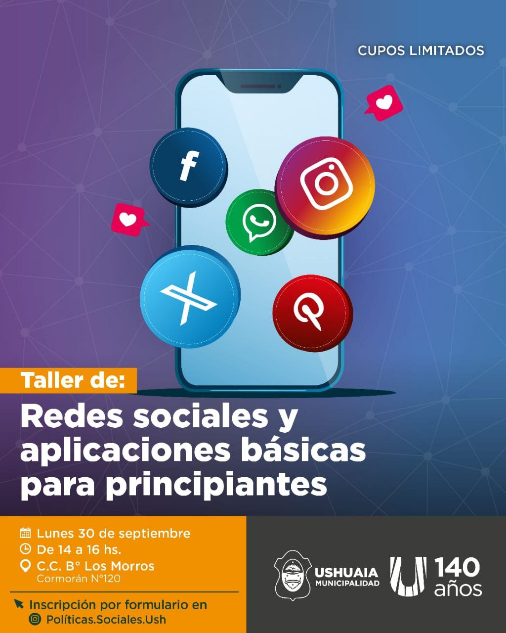 La Municipalidad de Ushuaia a través de la Secretaría de Políticas Sociales, Sanitarias y Derechos Humanos, invita a los vecinos y vecinas a participar del “Taller de Redes Sociales y Aplicaciones Básicas para Principiantes”, el cual tendrá lugar el lunes 30 de 14 a 16 horas en el Centro Comunitario, ubicado en la calle Cormorán N°120 del barrio Los Morros.
