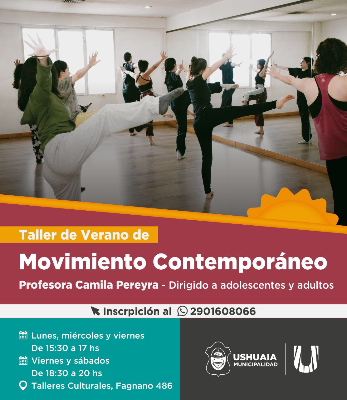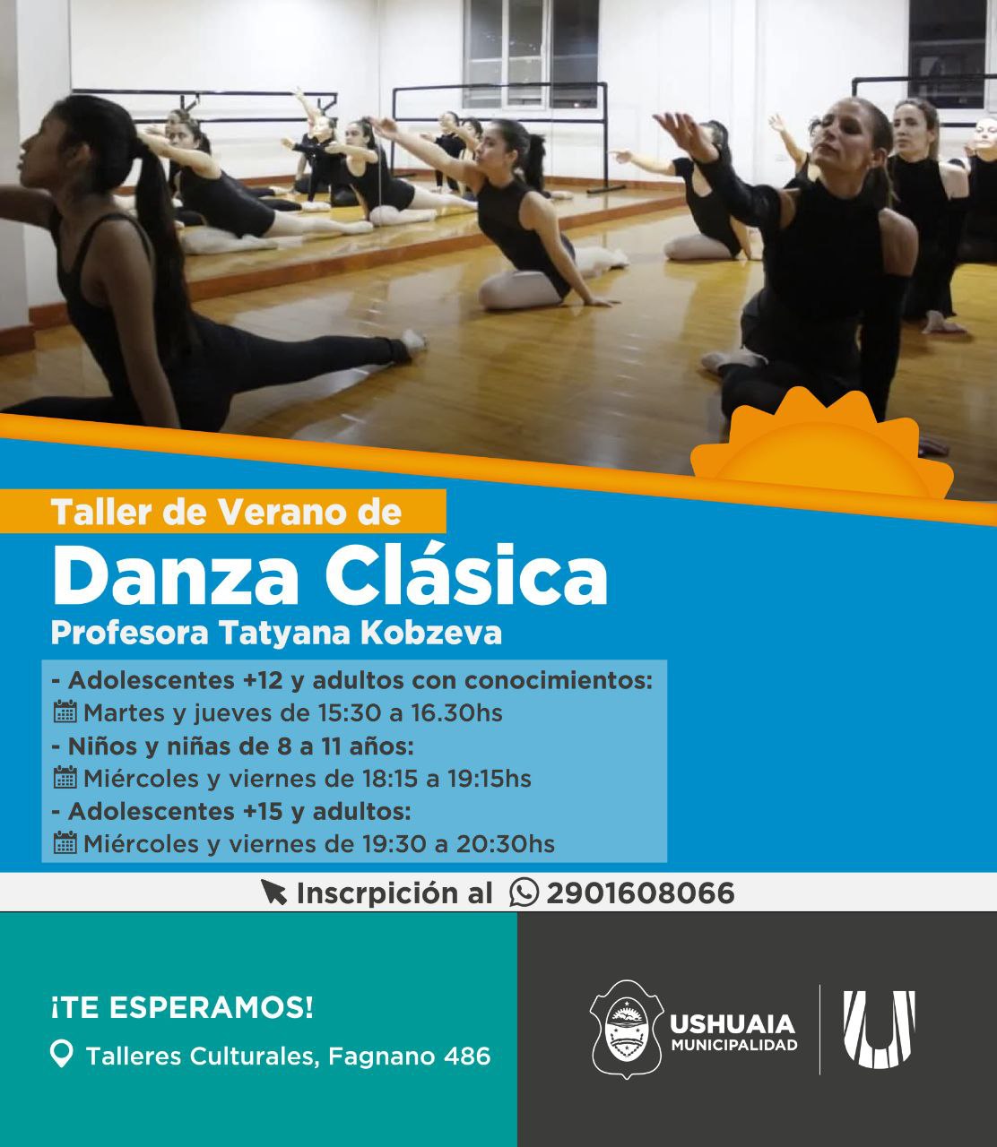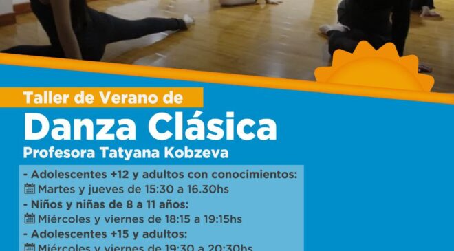 En lo que refiere a Danza Clásica, la propuesta será dictada por la profesora Tatyana Kobzeva con clases para adolescentes mayores de 12 años con conocimientos los días martes y jueves de 15:30 a 16:30 horas, para niños y niñas de 8 a 11 años los miércoles y viernes de 18:15 a 19:15 horas y para adolescentes mayores a 15 años y adultos los días miércoles y viernes de 19:30 a 20:30, siendo todos en los Talleres Culturales. Movimiento Contemporáneo, a cargo de Camila Pereyra, estará destinado a adolescentes y adultos con clases los días lunes, miércoles y viernes de 15:30 a 17:00 horas, así como los viernes y sábado de 18:30 a 20:00 horas en calle Fagnano. Finalizando la propuesta danzas estará el taller de Breaking por Omar Hirsig destinado a mayores de adolescentes mayores de 15 años y adultos con clases los días lunes, martes y sábado de 19:30 a 20:00 horas en el espacio de talleres culturales municipales.