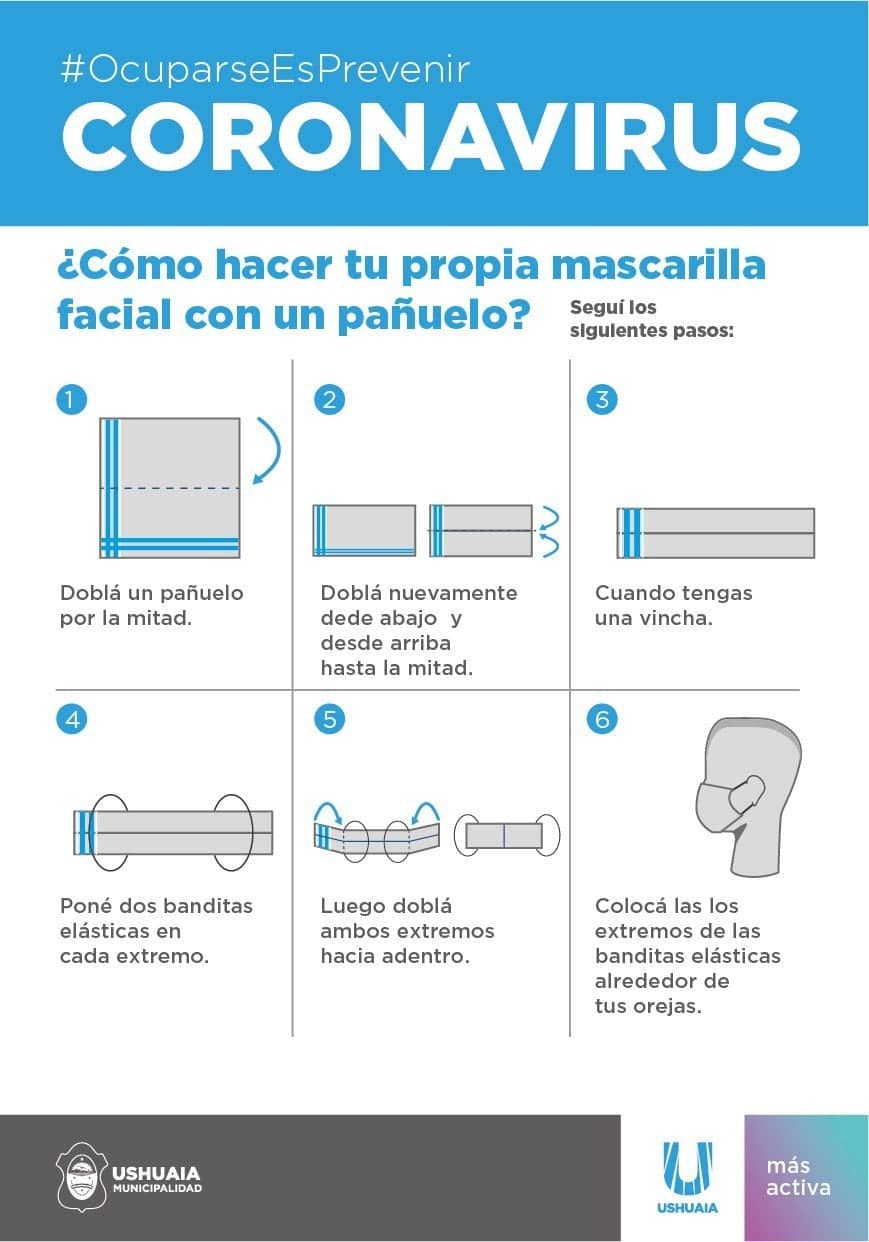 En el marco del decreto del Intendente Walter Vuoto que señala la obligatoriedad del uso de la mascarilla facial a partir del 14 de abril y se recomienda fuertemente su uso desde ahora, la Municipalidad de Ushuaia generó una serie de instructivos sobre cómo hacer una mascarilla casera con material del que se dispone en casa. En cada instructivo se explica paso a paso cómo generar una mascarilla fácil utilizando una remera, una bandana o un pañuelo.