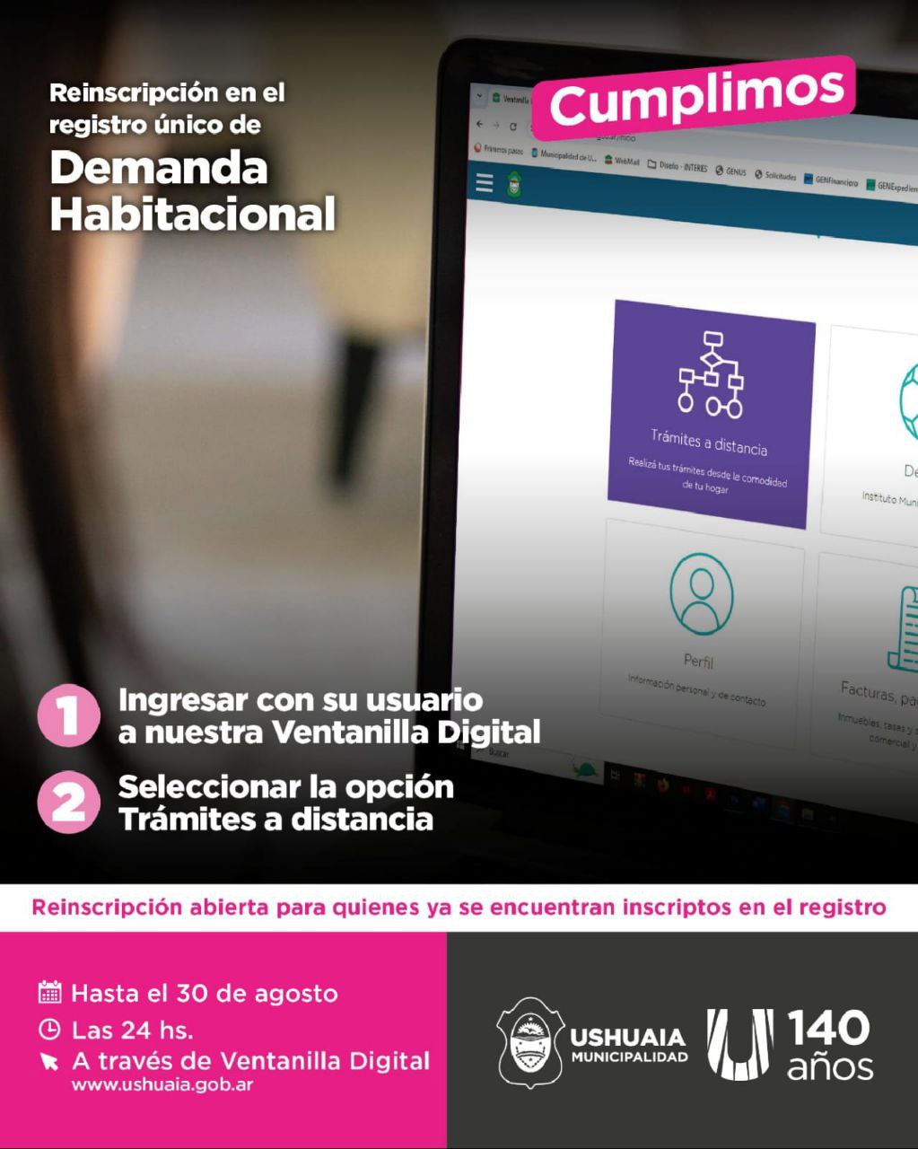 “La reinscripción puede realizarse a través de la Ventanilla Digital y consideramos que esta prórroga permitirá que aquellos vecinos que aún no lo hicieron, tengan el tiempo suficiente para reempadronarse”, explicó el Secretario municipal. “Buscamos obtener la más certera representación de la demanda habitacional en nuestra ciudad, teniendo en cuenta que algunas familias han optado por otras soluciones habitacionales o se trasladaron fuera de la provincia”, agregó.