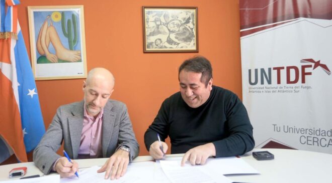 De la ceremonia de firma fueron parte el rector de la UNTDF, Mariano Hermida, la subsecretaria de Extensión, Vinculación y Servicios, María Ayelén Martínez, y el subsecretario de Promoción Educativa, José Luis Paredes, en representación de la Municipalidad de Ushuaia. Dicho convenio permitirá que la propuesta que articula lectura, escritura, creatividad, cocina y narración de cuentos “Cocineritos, Cuentos y Relatos” llegue al edificio de la casa de altos estudios.