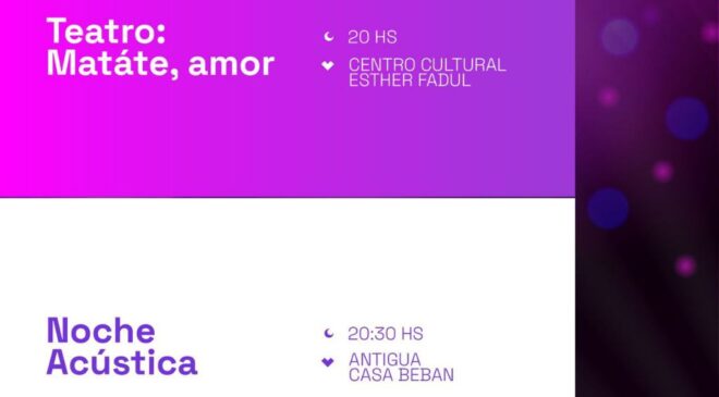 Los festejos comenzarán a las 20:00 horas con la presentación de la obra teatral “Matáte, Amor” en el Centro Cultural Esther Fadul. La misma contará con la actuación de Érica Rivas, texto de Ariana Harwicz y dirección de Marilú Marini. Ya a las 20:30 horas en la Antigua Casa Beban se llevará adelante la Noche Acústica, presentando los espectáculos de Lola Boffo y Shaniqua.