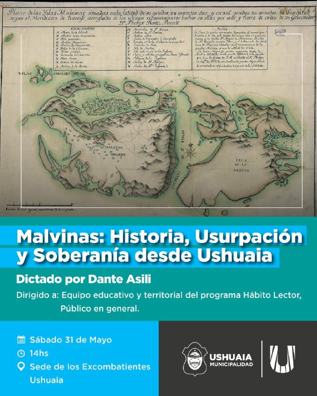 La Secretaría de Cultura y Educación de la Municipalidad de Ushuaia, a través de la Subsecretaría de Promoción Educativa y su programa Hábito Lector, llevará adelante este sábado 31 de mayo a las 14:00 horas en la sede los Ex-Combatientes de Ushuaia, ubicada en Alem N° 2008, la capacitación “Malvinas: Historia, usurpación y soberanía desde Ushuaia”.