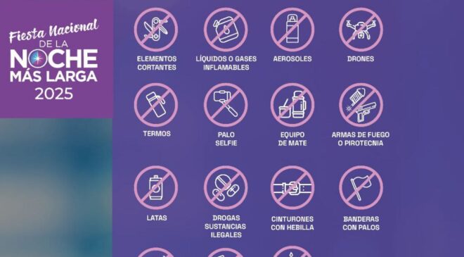 En el marco de la Fiesta Nacional de la “Noche Más Larga 2025”, la Municipalidad de Ushuaia informa a la comunidad sobre los elementos no permitidos para la entrada al Microestadio José “Cochocho” Vargas para la Noche de Folklore con Abel Pintos el día jueves 19, la Noche Tropical el día viernes 20 y la Noche de Rock con Dillom el sábado 21.