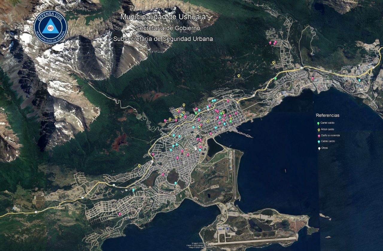 La Municipalidad de Ushuaia informó que, en un lapso aproximado de cinco horas, Defensa Civil Municipal, en articulación con los cuarteles de bomberos de la ciudad y la Dirección Provincial de Energía (DPE), respondieron a más de 60 emergencias registradas a través de la línea 103, a raíz del fuerte temporal de viento que afectó a la ciudad.