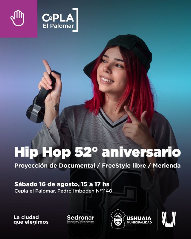 La Municipalidad de Ushuaia, a través de la Secretaría de Políticas Sociales, Sanitarias y Derechos Humanos, invita a la comunidad a participar de una jornada especial en conmemoración del 52° aniversario del Hip Hop, que se realizará el sábado 16 de agosto, de 15:00 a 17:00 horas, en el CePLA El Palomar (Pablo Imboden 1140).