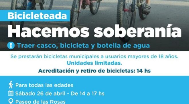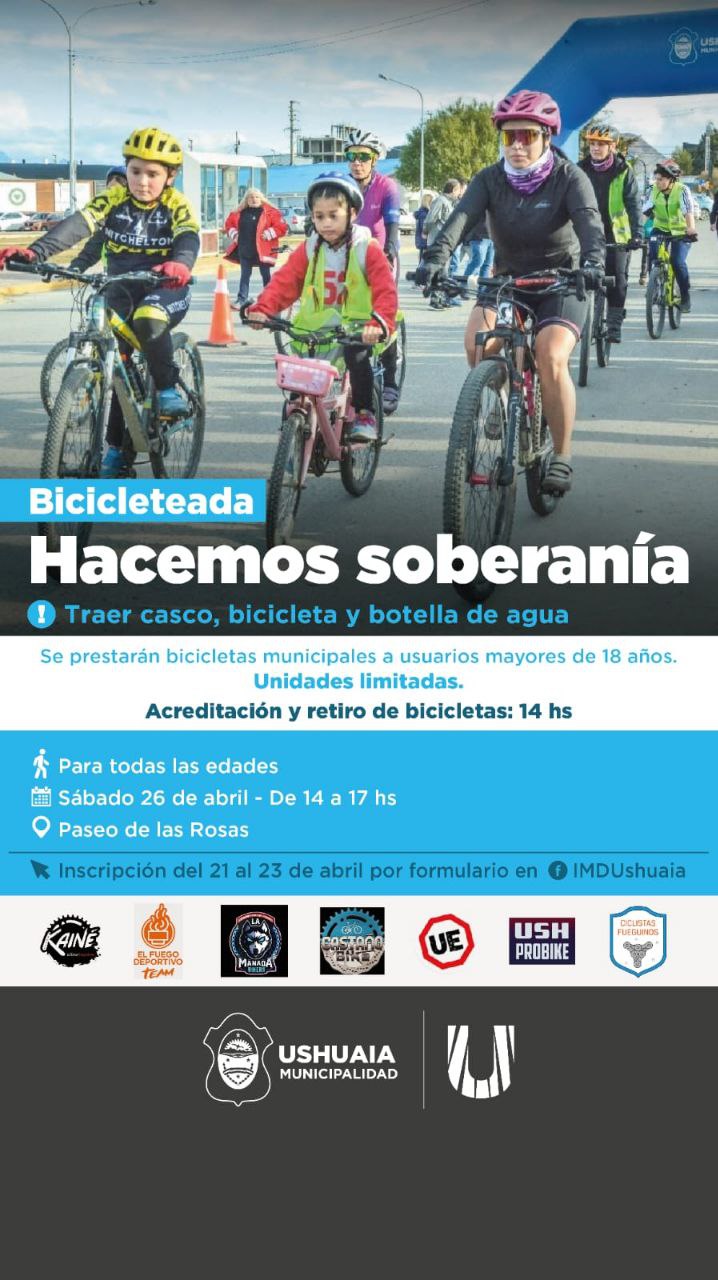 La Municipalidad de Ushuaia a través del Instituto de Deportes y un trabajo articulado entre las diferentes áreas, invita a las familias de la ciudad a participar de la bicicleteada familiar denominada “Hacemos Soberanía”, la cual tendrá lugar el próximo sábado en el Paseo de Las Rosas.