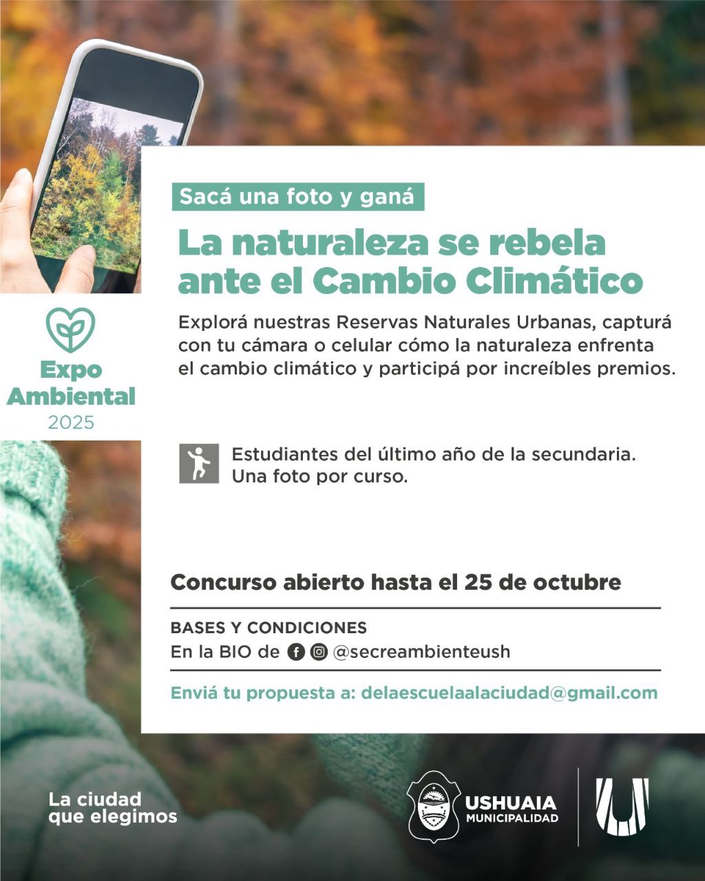 La Municipalidad de Ushuaia, a través de la Secretaría de Ambiente y las Reservas Naturales Urbanas (RNU), invita a las y los estudiantes del último año del nivel secundario a participar del concurso de fotografía “La naturaleza se rebela ante el cambio climático”, una propuesta que busca promover la conciencia ambiental y poner en valor la biodiversidad de los espacios naturales que rodean la ciudad.