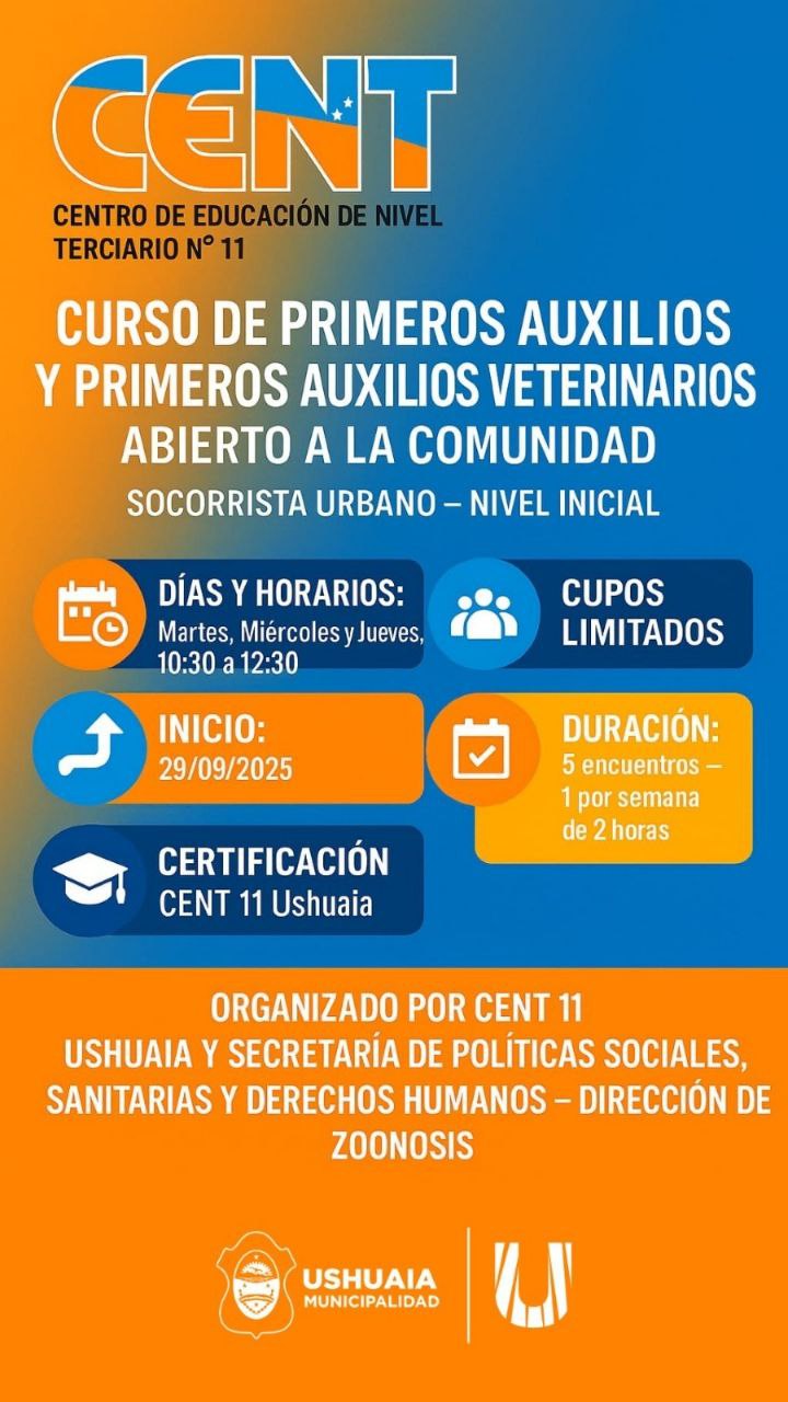 La Municipalidad de Ushuaia, a través de la Secretaría de Políticas Sociales, Comunitarias y Derechos Humanos y la Dirección de Zoonosis, invita a la comunidad a inscribirse en los cursos de Primeros Auxilios Veterinarios, en el marco del convenio firmado con el Centro Educativo de Nivel Terciario N.º 11 (CENT 11).