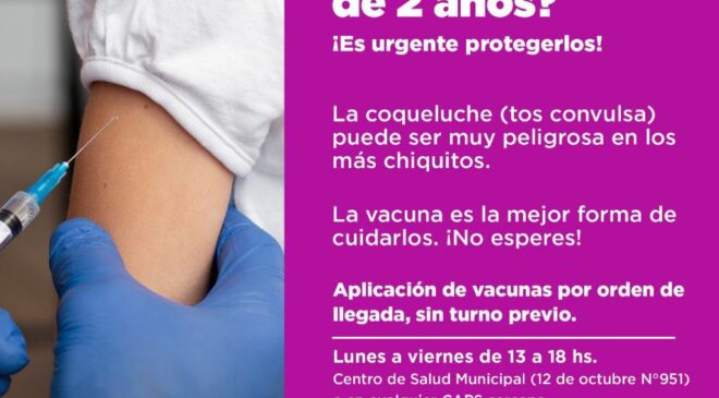 La Municipalidad de Ushuaia a través de la Secretaría de Políticas Sociales, Sanitarias y Derechos Humanos, lleva adelante una campaña especial de vacunación contra la coqueluche (tos convulsa), con el objetivo de prevenir contagios y proteger especialmente a los bebés y niños pequeños.