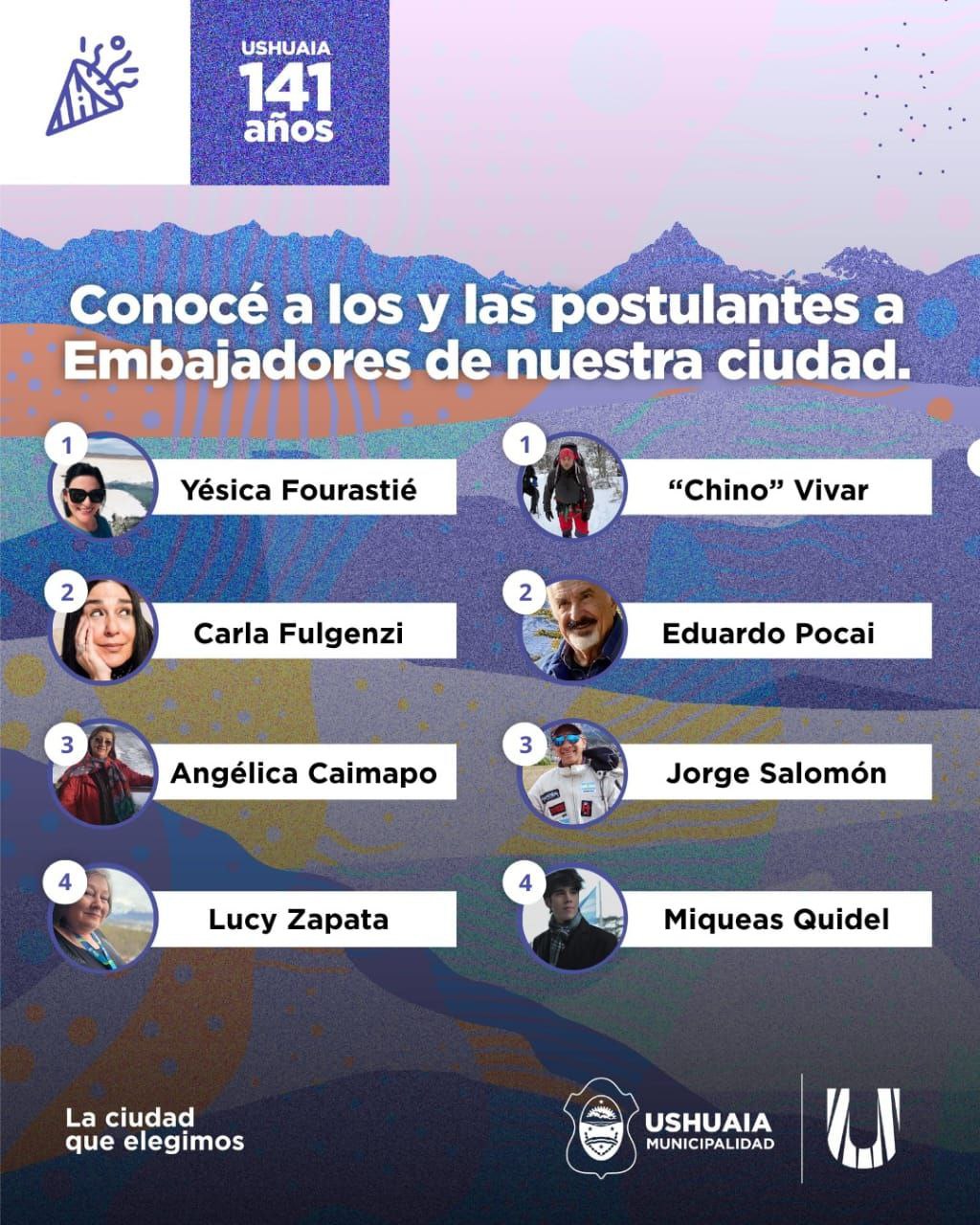 Dicha propuesta, que se encuentra en su novena edición bajo este nuevo formato, cuenta con 8 candidatos y candidatas propuestos por la comunidad que destacan por su rol comunitario y fueron seleccionados por un Comité de la Secretaría de Cultura y Educación con representación de Antiguos y Pioneros Pobladores, Pueblos Originarios, emabajadores salientes y diversas áreas del municipio. Así también, las y los que deseen participar de la votación, podrán encontrar el formulario en las redes sociales de la Municipalidad de Ushuaia y la Secretaría de Cultura y Educación en @ushuaiamunicipalidad y @culturayeducacionush.