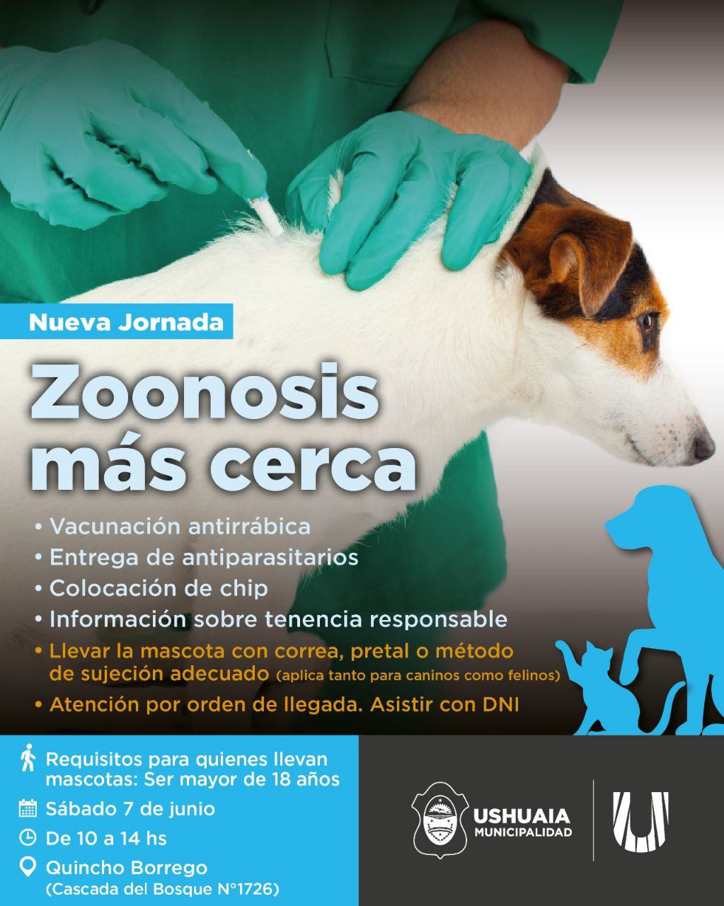La Municipalidad de Ushuaia a través de la Dirección de Zoonosis dependiente de la Secretaría de Políticas Sociales, Sanitarias y Derechos Humanos invita a los vecinos y vecinas a participar de la jornada territorial de atención veterinaria gratuita el sábado 7 de junio en el barrio de Valle de Andorra.