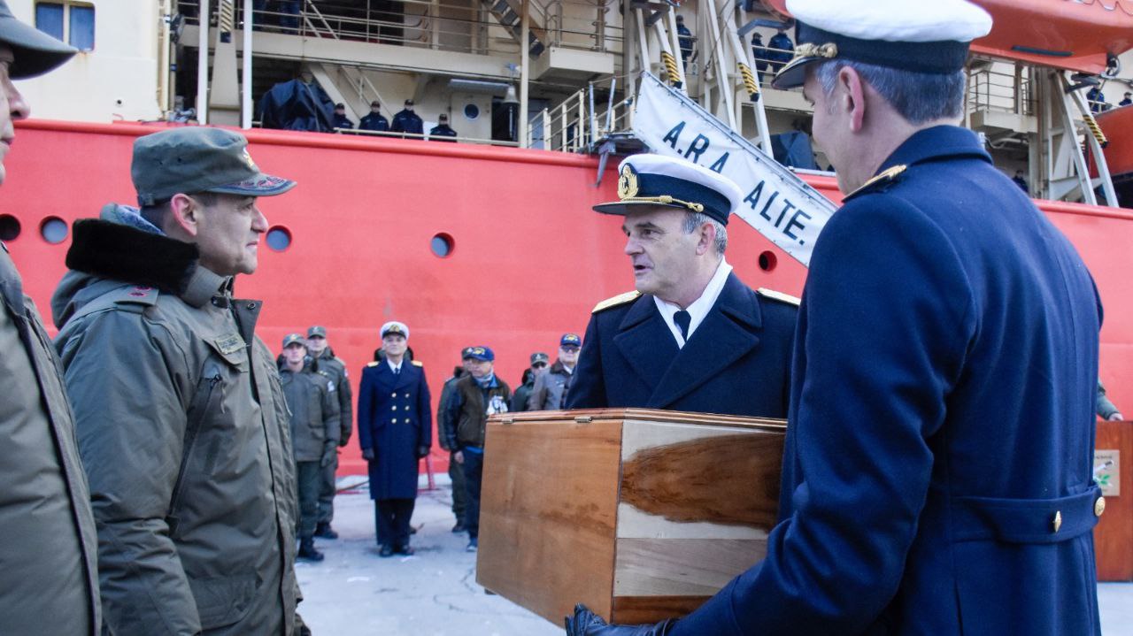 El Jefe de Comando de la Región VII, Comandante Mayor Fabio Benegas, entregó la bandera al Capitán de Fragata Carlos Alberto Recio, quien será responsable de su traslado en el viaje de regreso del rompehielos al finalizar la Campaña Antártica de Verano 2023-2024. Posteriormente será donada al Centro de Veteranos de Guerra de Gendarmería Nacional, ubicado en el edificio Centinela en Capital Federal.