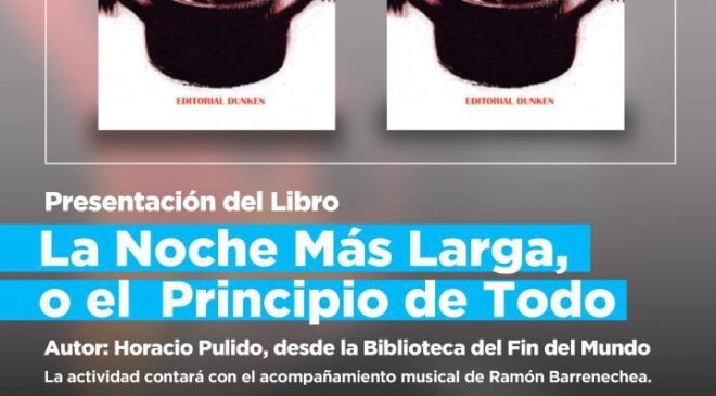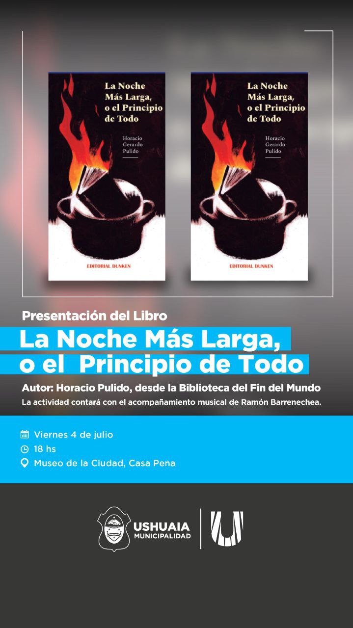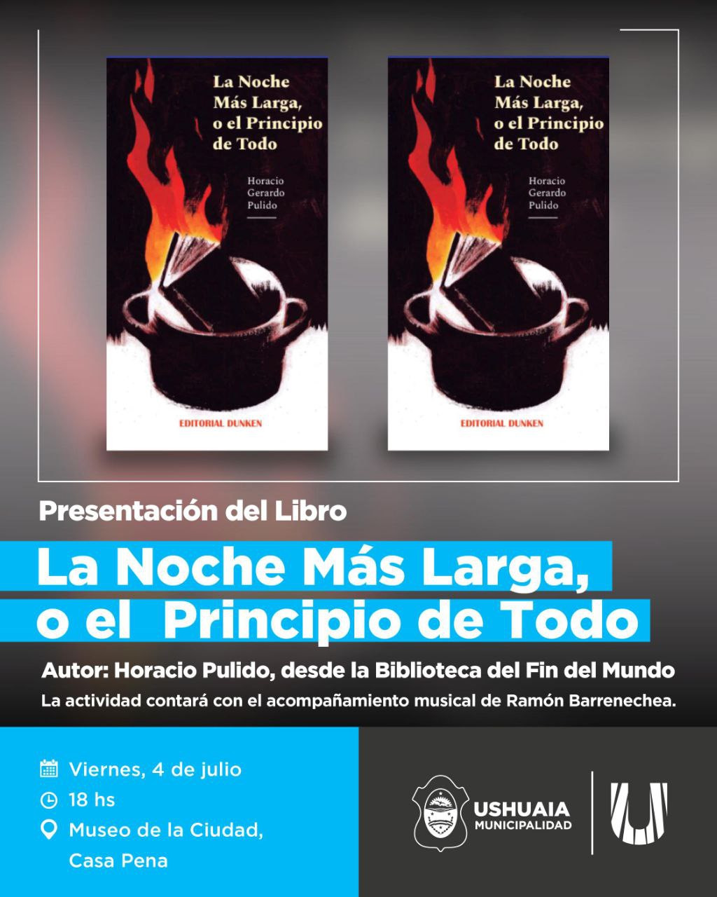 La Secretaría de Cultura y Educación de la Municipalidad de Ushuaia llevará adelante este viernes 4 de julio a las 18:00 horas en el Museo de la Ciudad – Casa Pena, la presentación del libro de Horacio Pulido “La Noche Más Larga, o el Principio de Todo”.