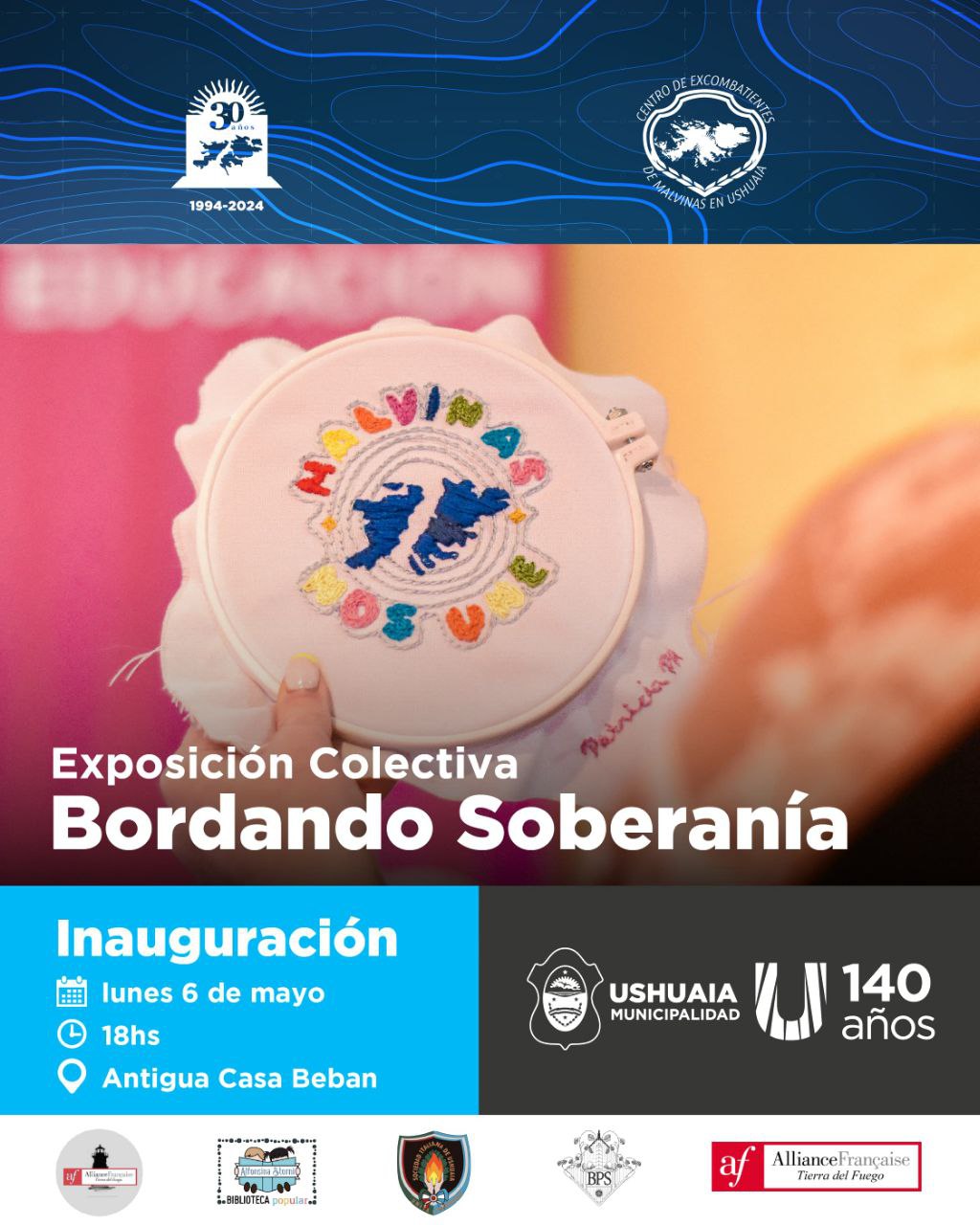 La Secretaría de Cultura y Educación de la Municipalidad de Ushuaia, en articulación con la Secretaría de Asuntos Malvinas, llevará adelante la exposición colectiva “Bordando Soberanía” que contará con su inauguración el día 6 de mayo a las 18:00 horas en la Antigua Casa Beban, pudiendo ser visitada hasta el 16 del mismo mes entre las 10:00 y 18:00 horas de lunes a viernes.