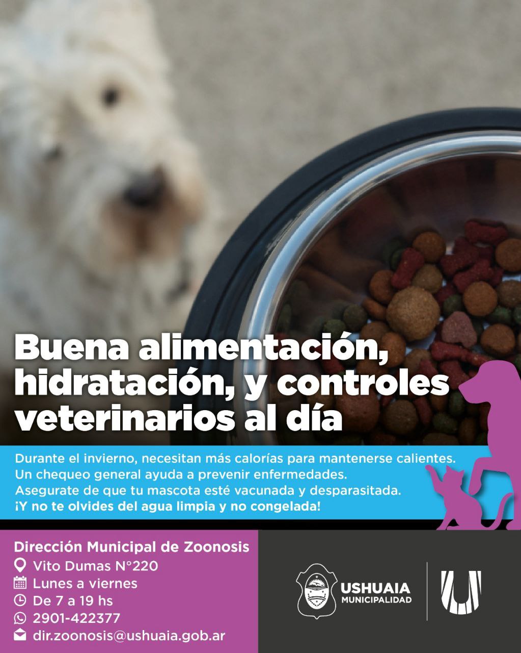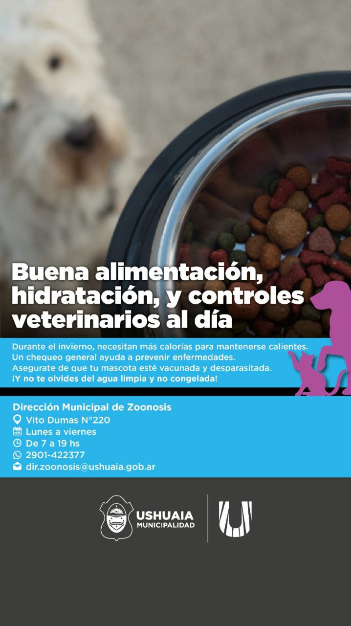 La Municipalidad de Ushuaia a través de la Dirección de Zoonosis dependiente de la Secretaría de Políticas Sociales, Sanitarias y Derechos Humanos promueve el cuidado integral de los animales de compañía durante los meses más fríos del año.