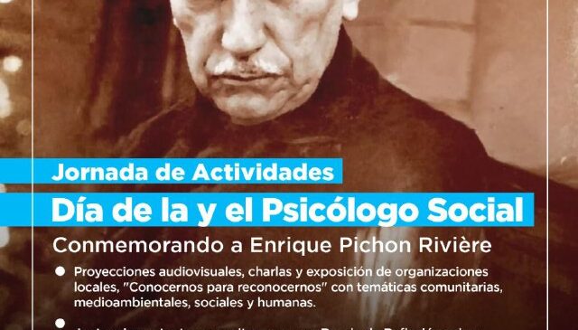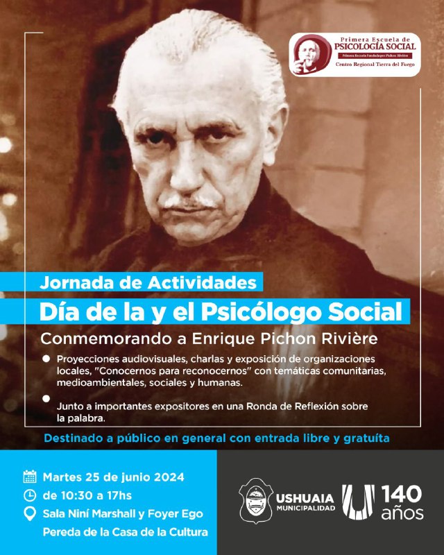 La Municipalidad de Ushuaia, a través de la Secretaría de Cultura y Educación, llevará adelante este martes 25 de junio de 10:30 a 17:00 horas en la Sala Niní Marshall y el Foyer Ego Pereda de la Casa de la Cultura una jornada de actividades en conmemoración del Día de la y el psicólogo social, natalicio del psicólogo social argentino y padre de la disciplina Enrique Pichon Riviere.