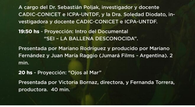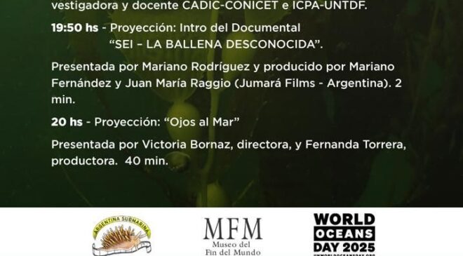 Con actividades los días viernes 6, sábado 7 y domingo 8 en el Museo del Fin del Mundo, la Universidad Nacional de Tierra del Fuego y el Paseo del Fuego Shopping, las actividades en la Sala Niní Marshall comenzarán a las 19:15 horas del viernes con la charla ¿Cómo podemos cuidar nuestro mar? A cargo del Dr. Sebastián Poljak, investigador y docentes de CADIC-CONICET e ICPA-UNTDF junto a la Dra. Soledad Diodato, investigadora y docente CADIC-CONICET e ICPA-UNTDF. A las 19:50 se llevará adelante la proyección de la introducción del documental “Sei – La Ballena Desconocida”, presentado por Mariano Rodríguez y producido por él junto a Juan María Raggio. Finalizando a las 20:00 horas se realizará la proyección de “Ojos al Mar”, presentada por Victoria Bornaz, su directora, y Fernanda Torrera, productora del cortometraje.