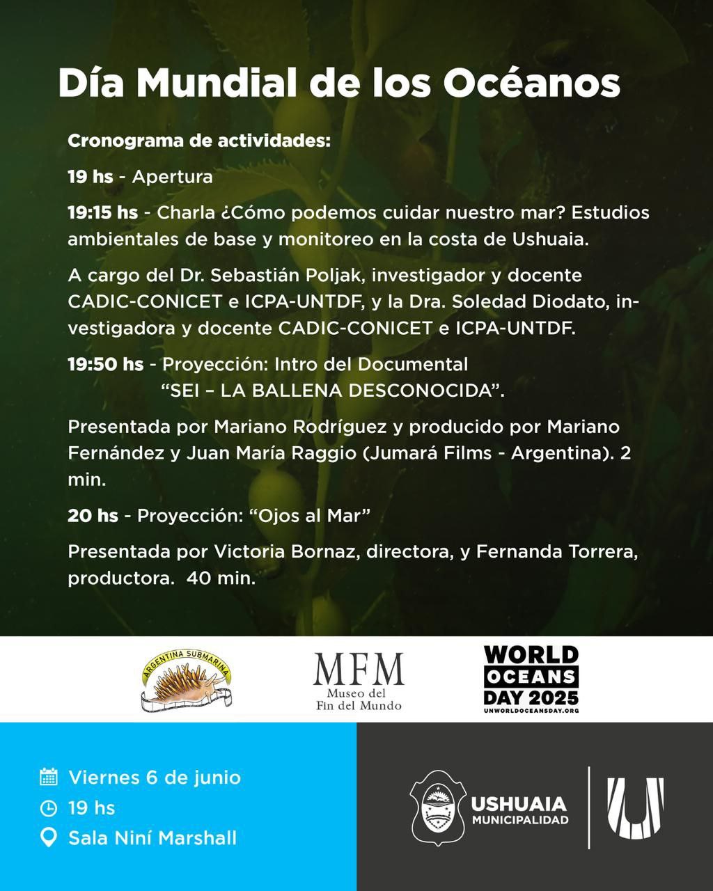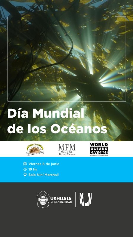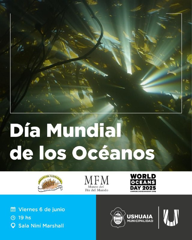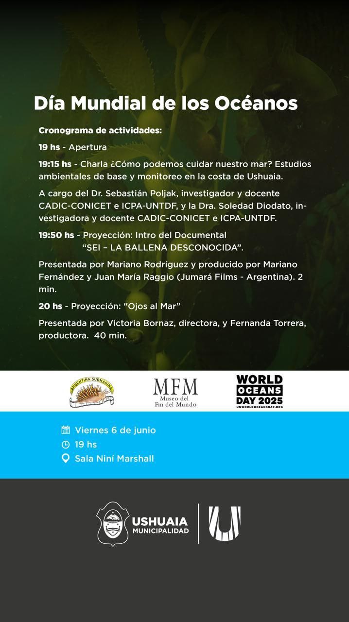 La Municipalidad de Ushuaia, a través de la Secretaría de Cultura y Educación, acompañará las actividades por el “Día Mundial de los Océanos 2025”, contando con charlas y proyecciones el día viernes 6 de junio en la Sala Niní Marshall de la Casa de la Cultura.