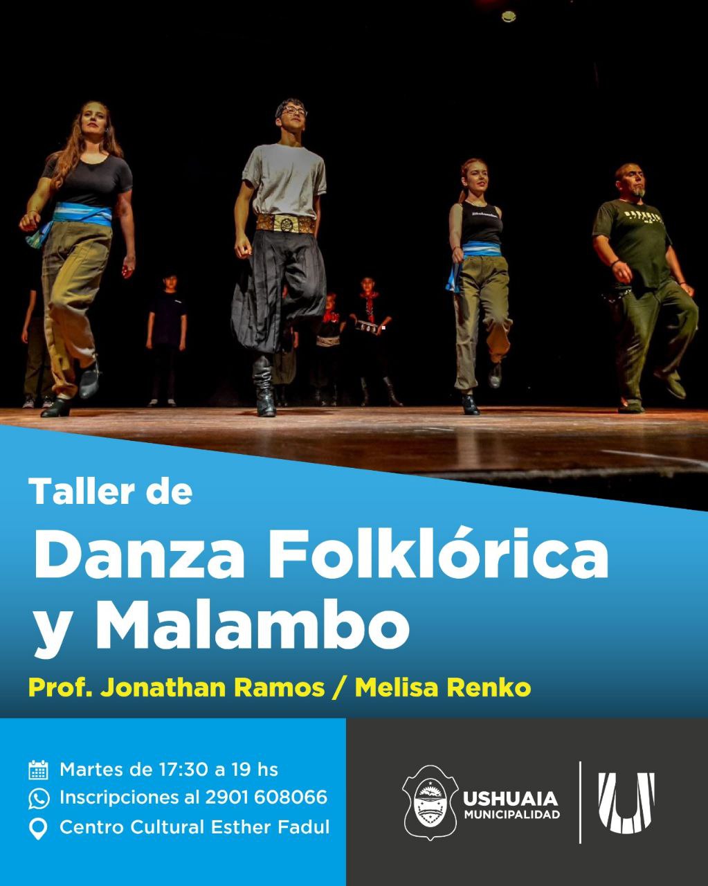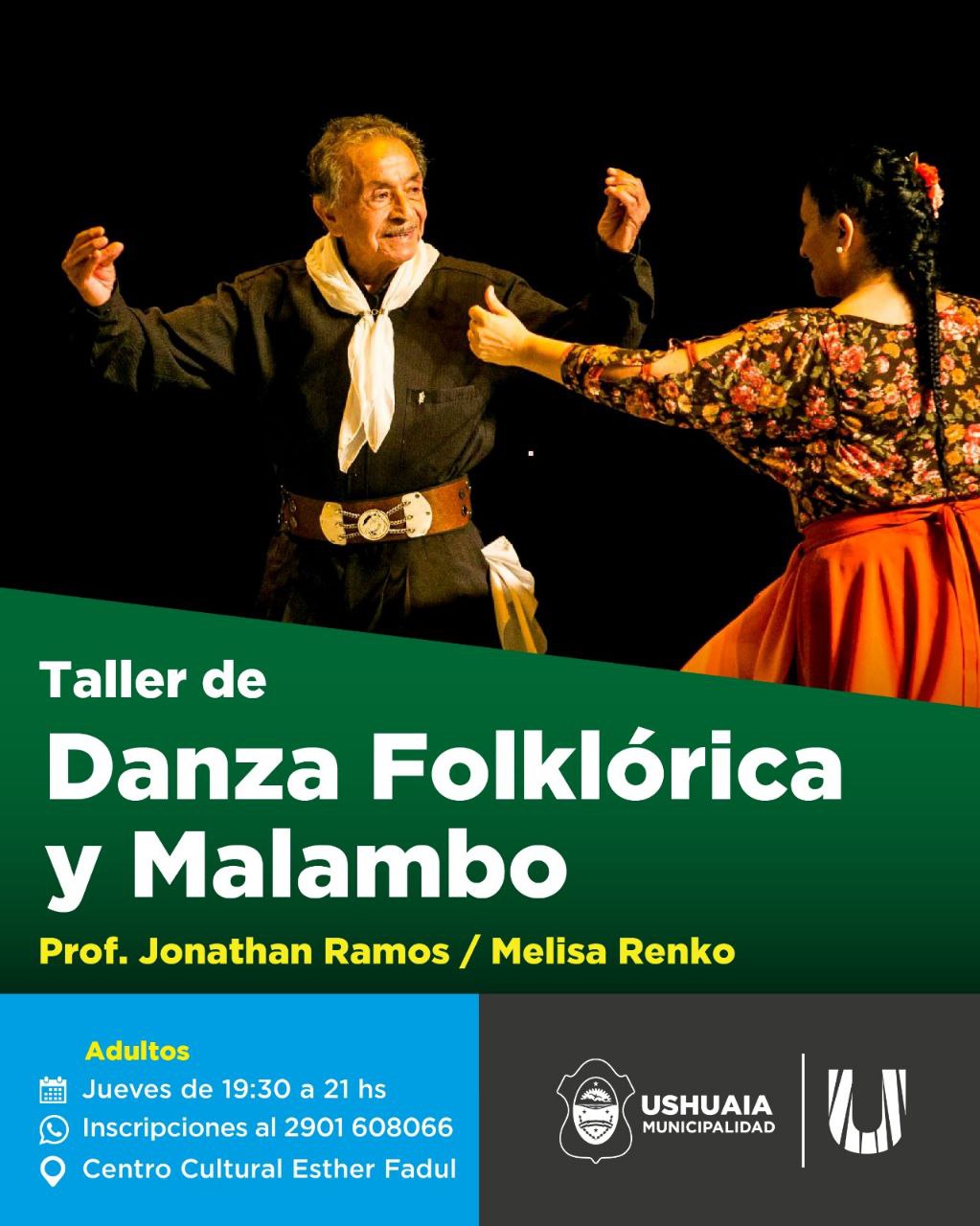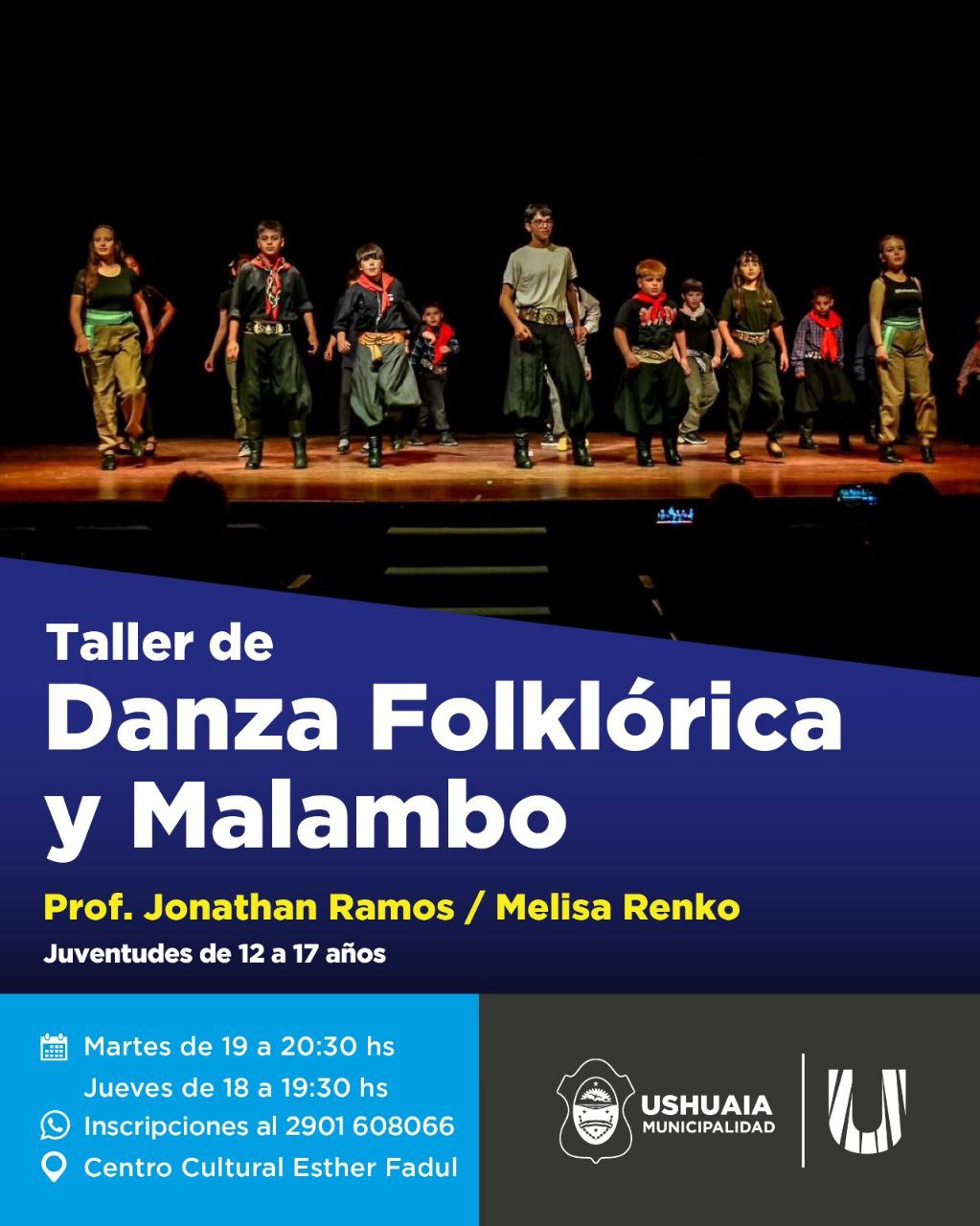 La Municipalidad de Ushuaia, a través de la Secretaría de Cultura y Educación, llevará adelante los talleres de Folklore en el Centro Cultural Esther Fadul, siendo dictados los mismos por el profesor Jonathan Ramos y la profesora Melisa Renko. Quiénes deseen inscribirse o conocer más sobre los mismos, podrán hacerlo a través del WhatsApp 2901-608066
