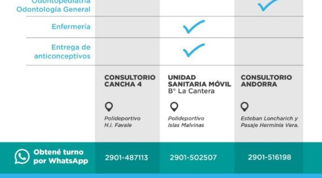 La Secretaría de Políticas Sociales, Sanitarias y Derechos Humanos recuerda vecinas y vecinos de la ciudad que la unidad sanitaria móvil se encuentra ubicada junto al polideportivo Islas Malvinas en el barrio La Cantera y brinda atención Médica General, Nutrición, Pediatría, Enfermería y también hace entrega de anticonceptivos. Los turnos para atención en el lugar deben solicitarse a través del whatsapp (2901) 502507.