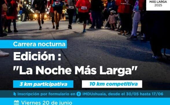 La Municipalidad de Ushuaia informó que continúan abiertas las inscripciones para la carrera nocturna de “La Noche Más Larga hasta el 17 de junio próximo, siendo ya más de 300 los corredoras y corredores inscriptos garantizando una gran convocatoria por parte de la comunidad.