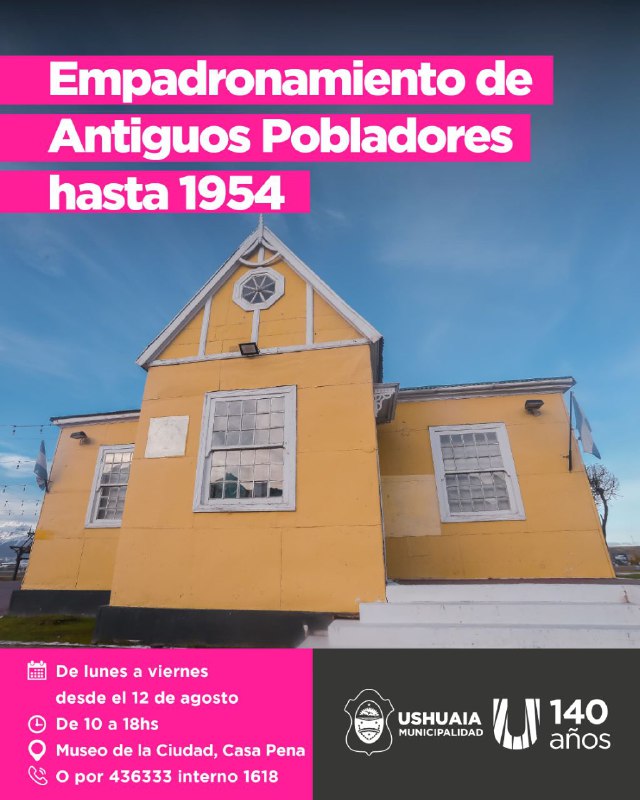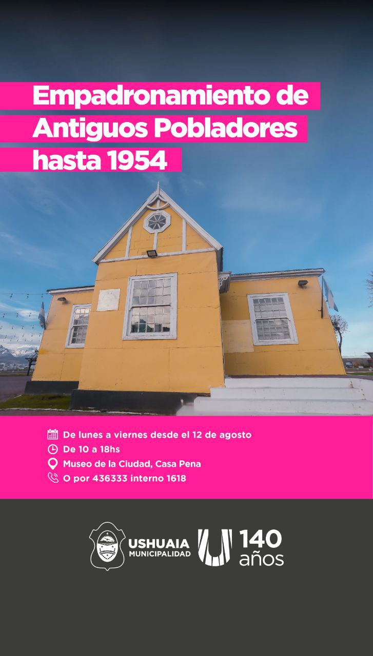 El trámite podrá ser realizado de lunes a viernes desde el 12 de agosto en adelante entre las 10:00 y 18:00 horas en el Museo de la Ciudad “Casa Pena” o por la vía telefónica al 436333 interno 1618. El objetivo, es sumar a las y los antiguos pobladores no registrados a las actividades por el 140° Aniversario de Ushuaia, así como las propuestas impulsadas por la Comisión de Antiguos y Pioneros Pobladores durante el año.