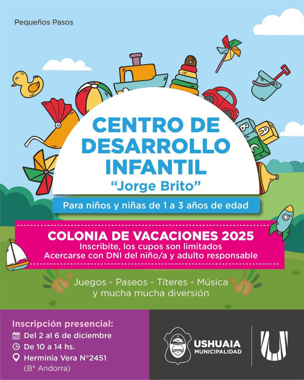 La Secretaría de las Mujeres, Géneros y Diversidades de la Municipalidad de Ushuaia informó que desde el lunes 2 y hasta el viernes 6 de diciembre se realizarán las inscripciones para la colonia de vacaciones del Centro de Desarrollo Infantil “Jorge Brito”, destinada a niños y niñas de 1 a 3 años.