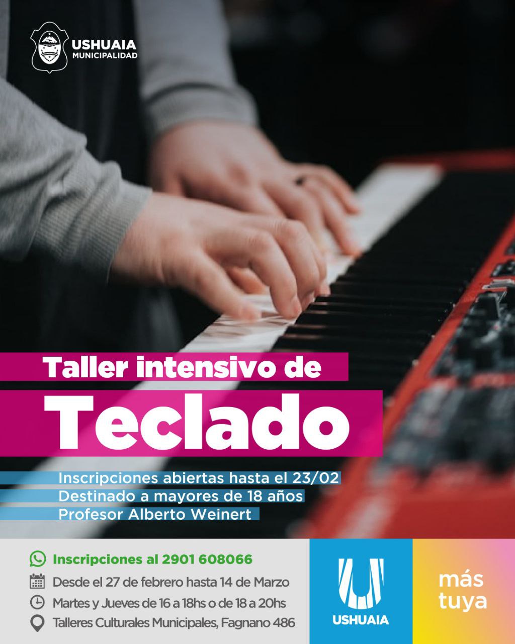 La Secretaría de Cultura y Educación de la Municipalidad de Ushuaia invita a vecinos y vecinas a participar del taller intensivo de “Teatro Musical” a cargo de las profesoras Ximena Rosé Cholvis y Eugenia Rufino. Las y los interesados, podrán inscribirse a través del WhatsApp 2901-608066.