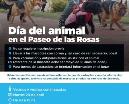 En el marco de la celebración por el Día del Animal, el municipio llevará adelante una jornada abierta para compartir actividades junto a las mascotas de compañía, el martes 29 de 10 a 15 horas en el Paseo de las Rosas.