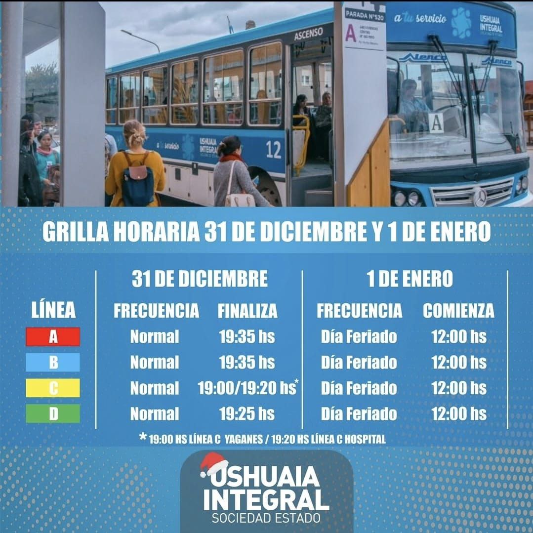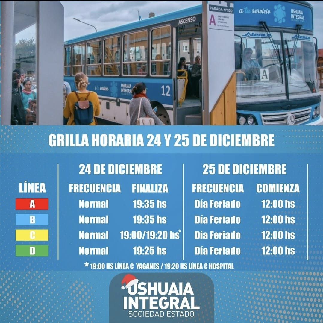 Ushuaia Integral Sociedad del Estado informa a la comunidad que el Transporte Público de Colectivos, tendrá horario reducido durante las Fiestas Navideñas y de Año Nuevo.