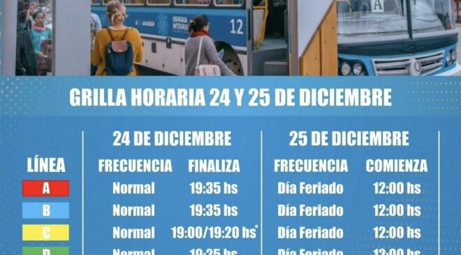 El miércoles 25 de diciembre y el miércoles 1° de enero el servicio se prestará con la frecuencia que corresponde a los días feriados, iniciando los recorridos a partir de las 12 horas para todas las líneas.