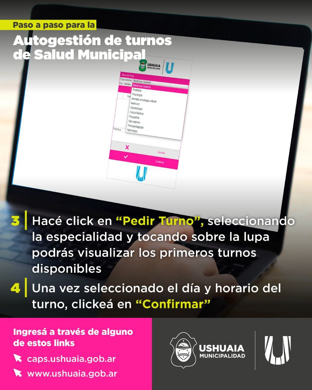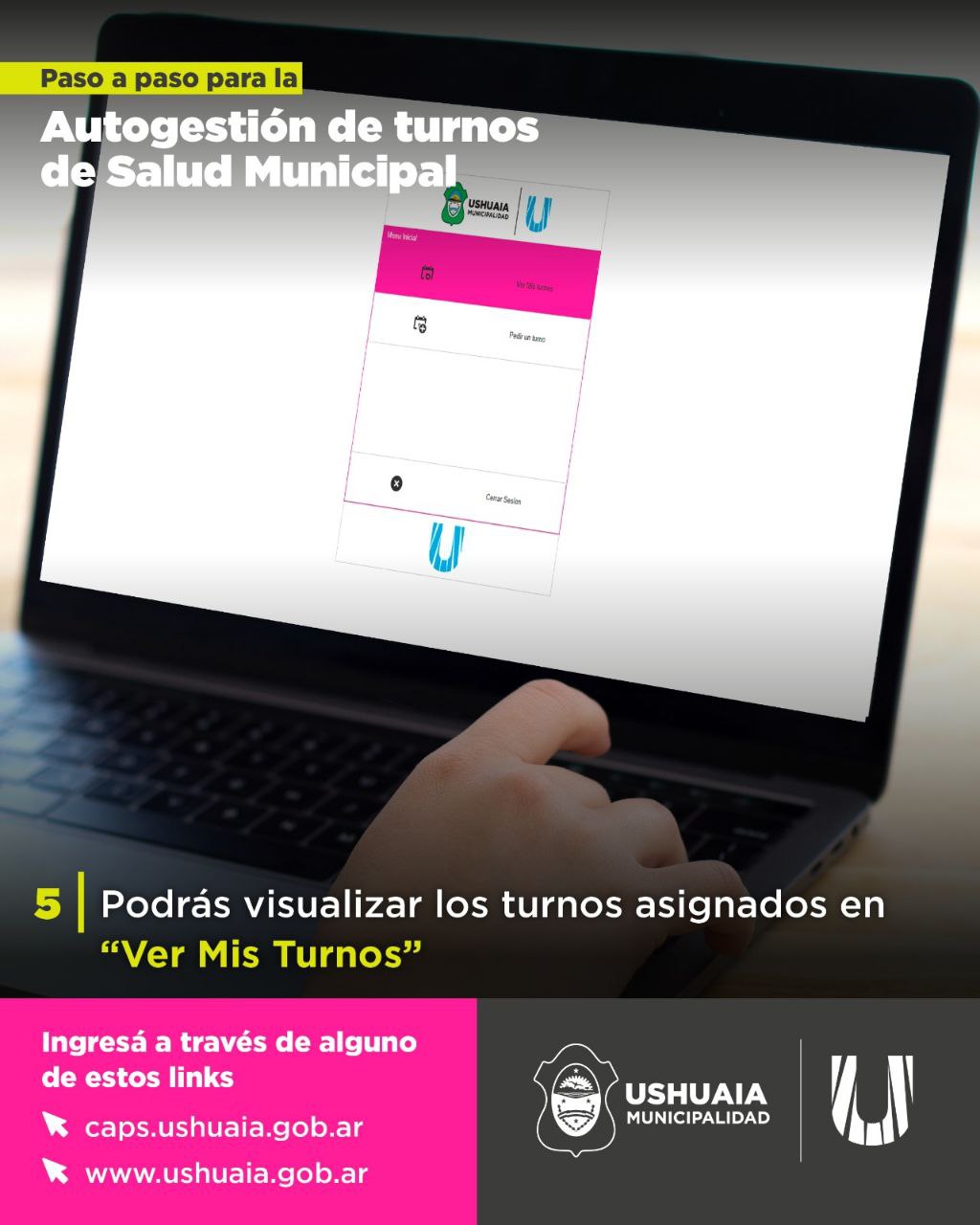La Municipalidad de Ushuaia, a través de la Secretaría de Políticas Sociales, Sanitarias y Derechos Humanos, implementó el sistema de turnero digital que permite a los vecinos y vecinos de la ciudad gestionar turnos de manera online para atenderse en el Centro de Salud Municipal.