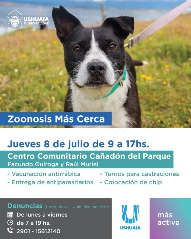 La Municipalidad de Ushuaia, a través de la Dirección de Zoonosis, impulsará una nueva jornada de su programa Zoonosis Más Cerca enfocado al cuidado responsable de mascotas. A realizarse el jueves 8, se atenderá a los vecinos y vecinas que se acerquen al Centro Comunitario Cañadón del Parque, ubicado en la intersección de las calles Facundo Quiroga y Raúl Muriel entre las 9 y 17 horas. Lisandro Fonrradona, coordinador Territorial de Políticas Sanitarias, destacó que “se estarán brindando la vacuna antirrábica y antiparasitarios, así como turnos para castraciones de caninos y felinos”.