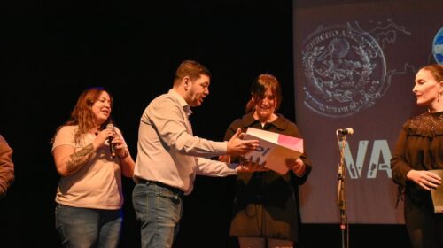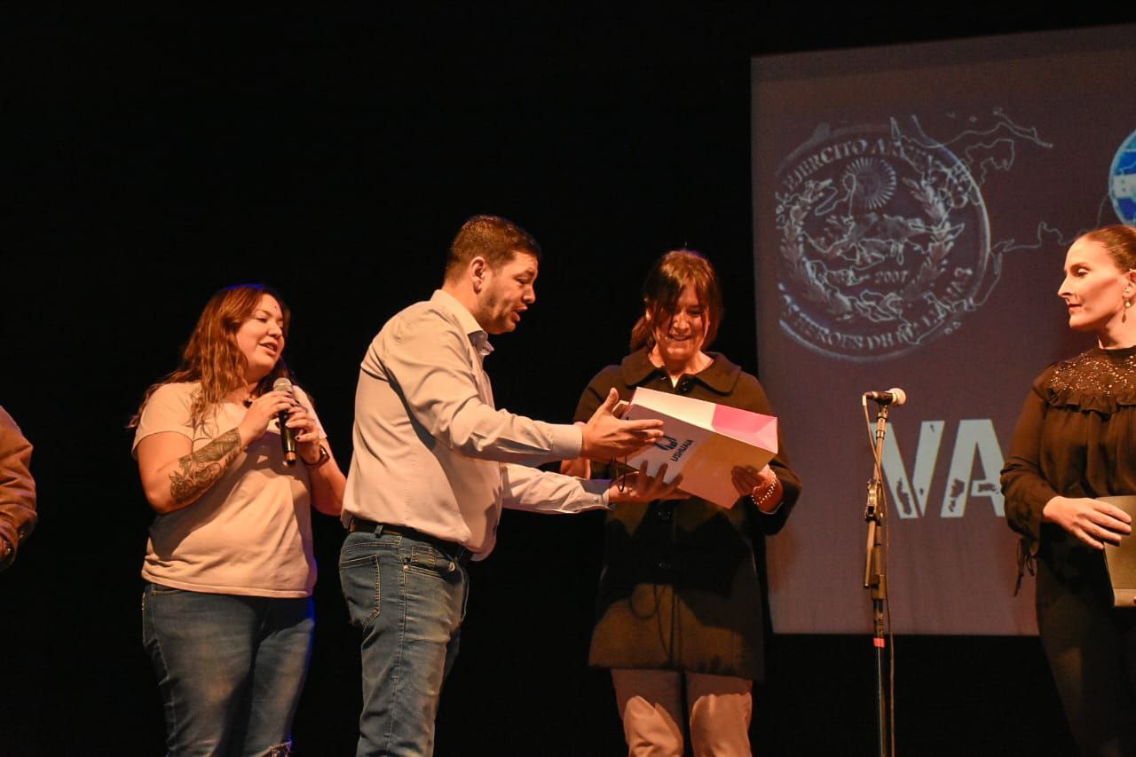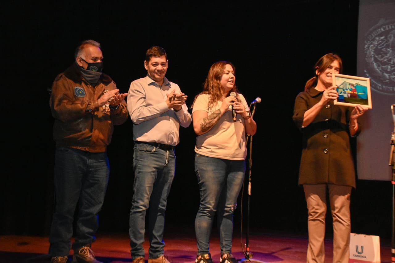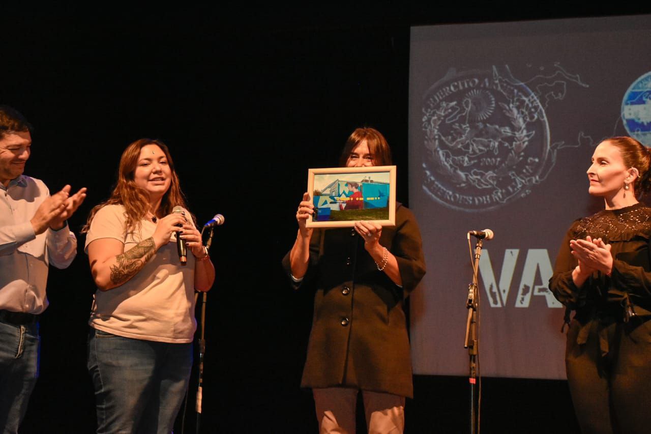 Durante la presentación de “Valientes: una historia de mujeres”, la secretaría de Cultura y Educación, junto al secretario de Economía y Finanzas, David Ferreyra, entregaron un reconocimiento a la VGM Mariana Soneira, quién es retratada en la obra por su rol como radio operadora naval de la Armada Argentina. El presente constó de una réplica del mural que homenajeó a las veteranas durante la 3° Edición del Encuentro Internacional de Muralistas del Fin del Mundo.