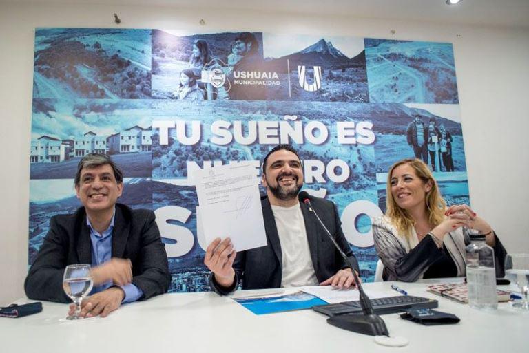 El intendente de Ushuaia, Walter Vuoto, acompañado del senador nacional Matías Rodríguez y de la secretaria de Hábitat y Ordenamiento Territorial, Lorena Henriques Sanches, realizó la firma de un convenio marco con la Ministra de Desarrollo Territorial y Hábitat de la Nación Argentina, María Eugenia Bielsa, para la adhesión del Municipio al Programa Nacional de Suelo Urbano, lo que permitirá realizar diferentes obras en la ciudad.