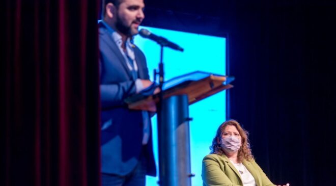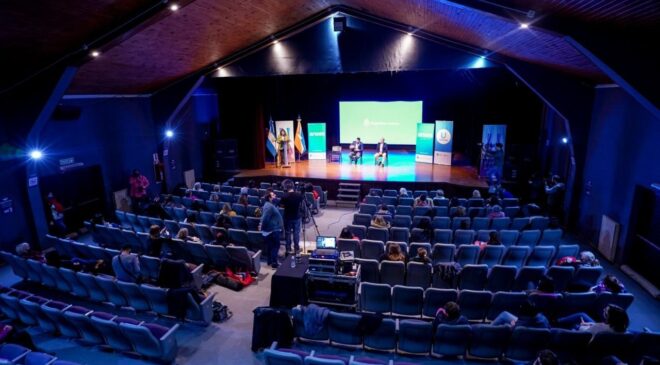 El intendente de Ushuaia Walter Vuoto, junto a la diputada nacional Carolina Yutrovic y al gerente de ANSES César Colantonio encabezaron un acto en la sala Niní Marshall en el que presentaron el plan de Reconocimiento de Aportes por Tareas de Cuidado de la ANSES.